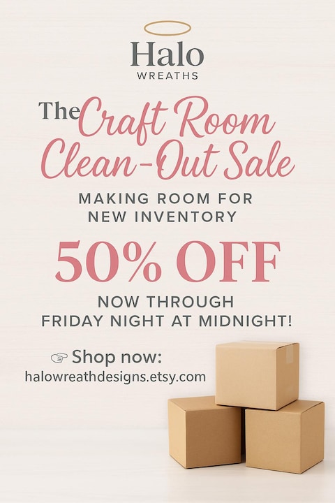I’m having a limited-time sale — 50% OFF my entire inventory! Now through Friday night at midnight, enjoy half off all ready-to-ship wreaths, swags, and florals. Each piece is handmade with love and farmhouse charm — once they’re gone, they’re gone! Don’t wait, pretty friends — grab your favorites before they sell out! 🕒 Sale Dates: Now through Friday at midnight 📦 Shipping: All orders ship within 1–2 business days
