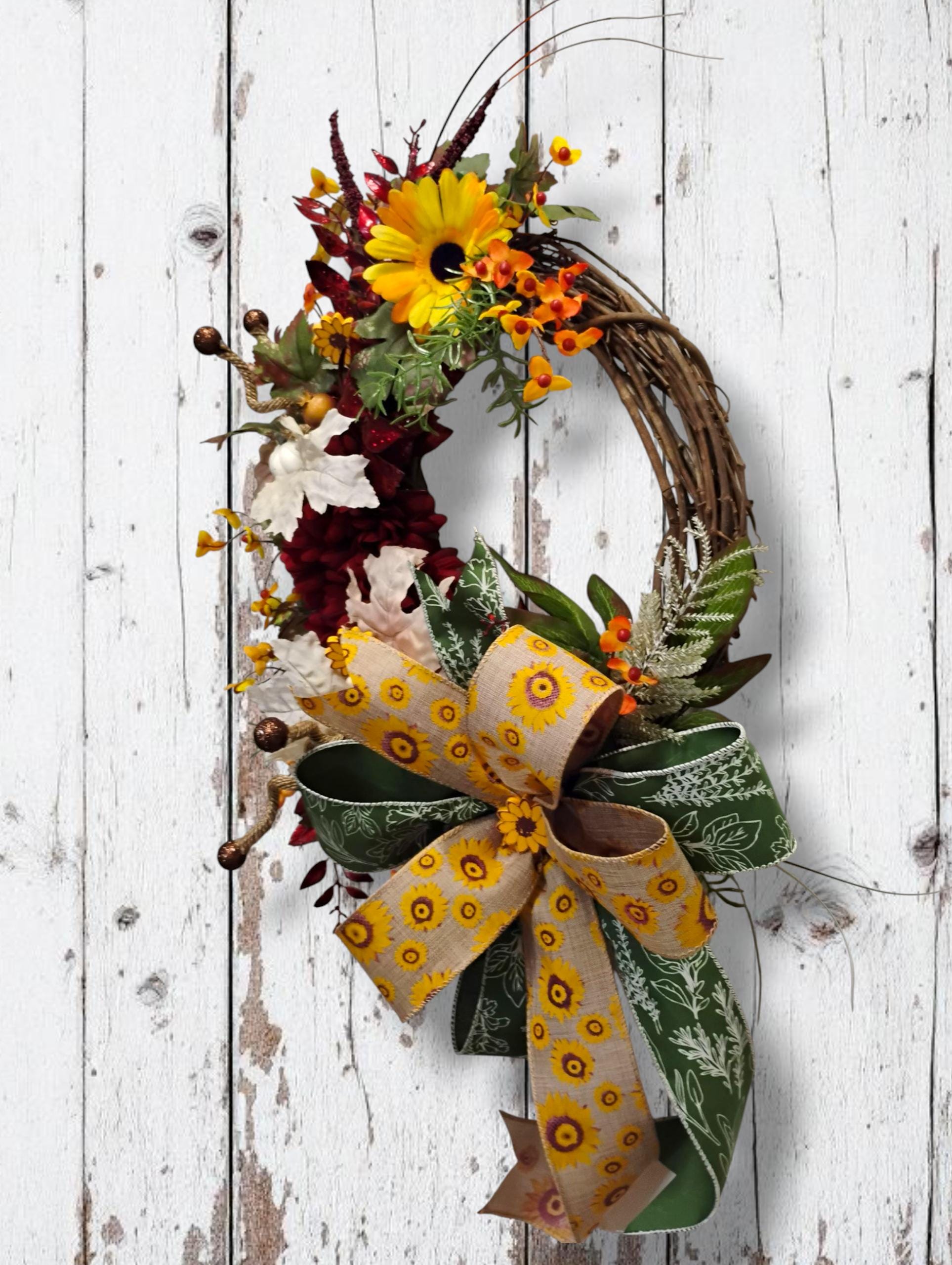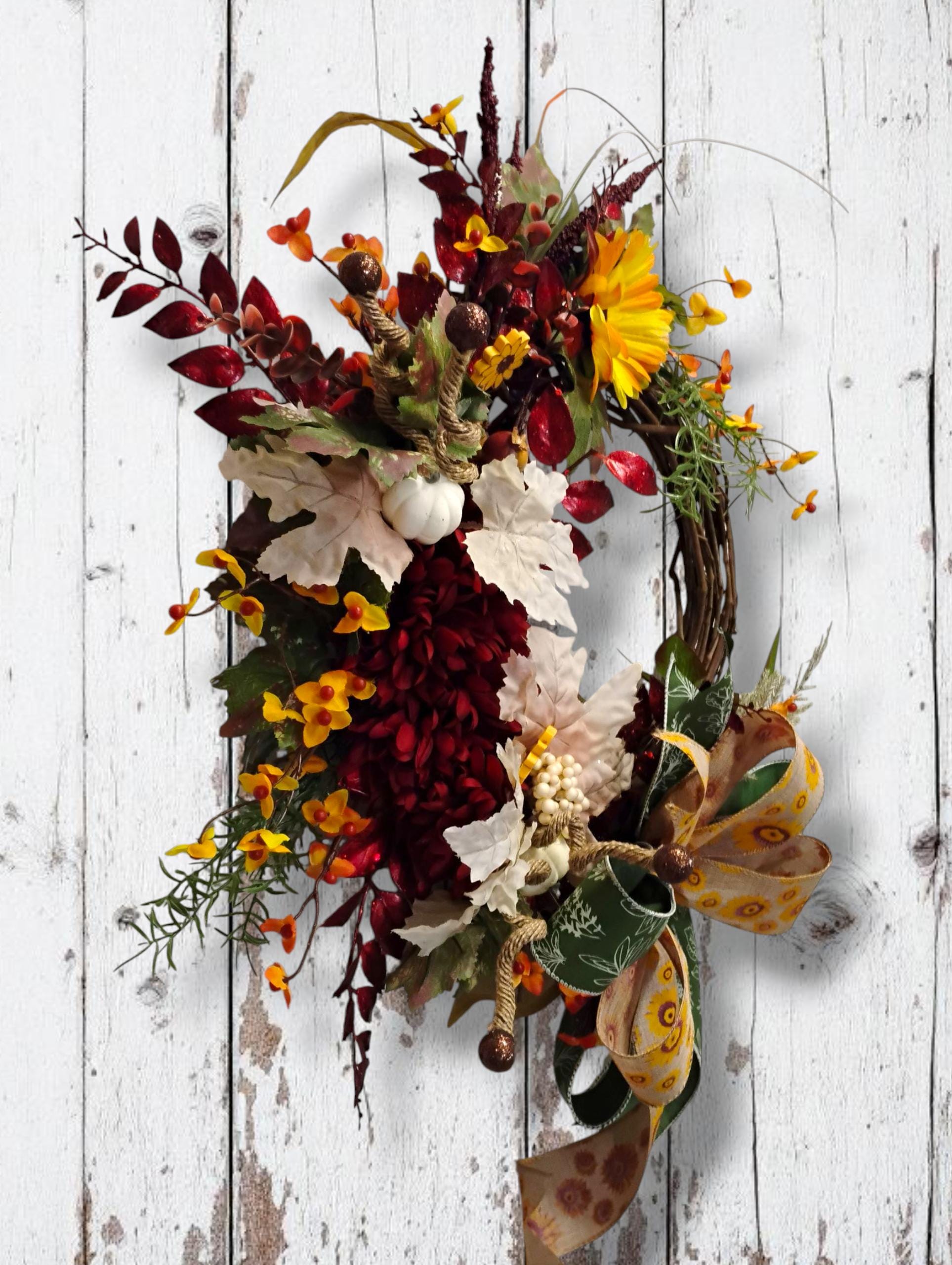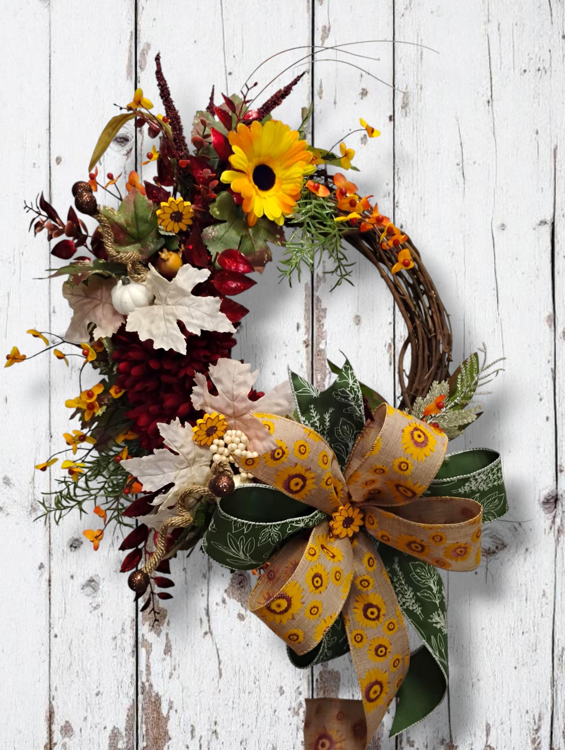 Bring the rich, cozy warmth of fall to your front door with this stunning jewel-toned grapevine wreath. Featuring deep reds, golden yellows, lush greenery, white pumpkins, yellow sunflowers and lifelike bittersweet berries, this wreath captures the essence of autumn in a bold and elegant way. Created on a natural grapevine base and arranged in a flowing crescent style, it’s perfect for September through Thanksgiving. It's topped off with a gorgeous green and sunflower fluffy bow!Hang it on your front door, above a mantle, or in any space that needs a touch of fall charm.