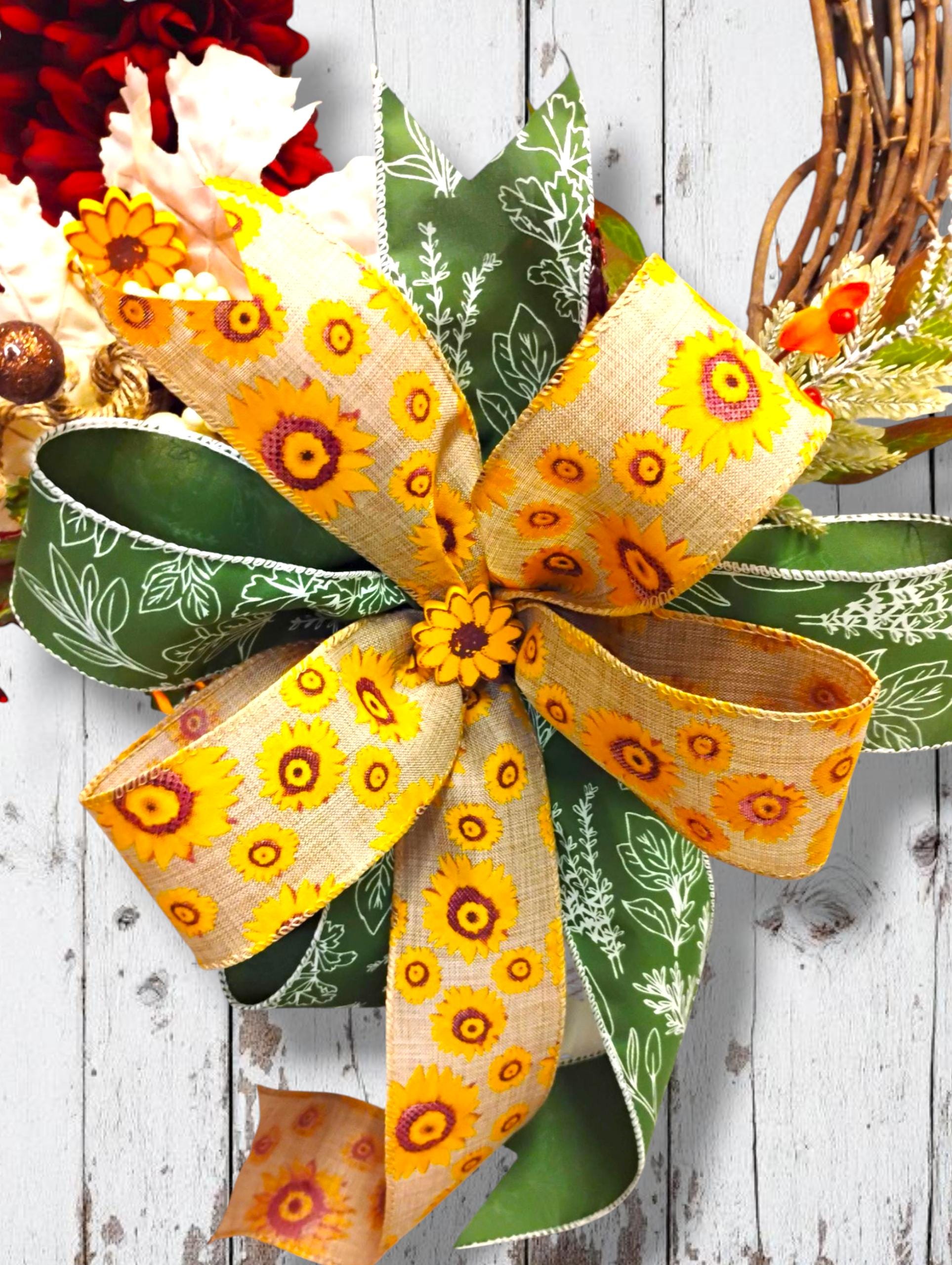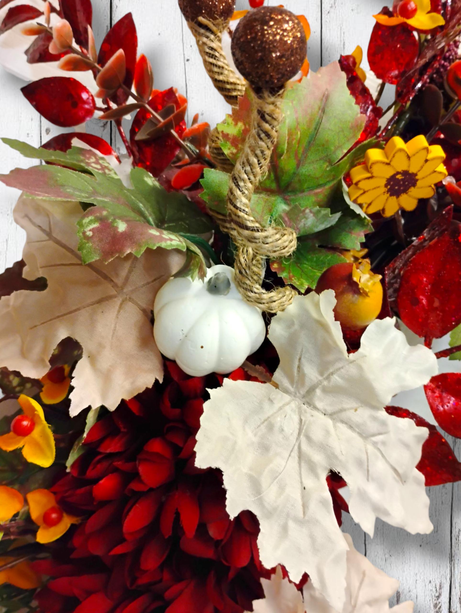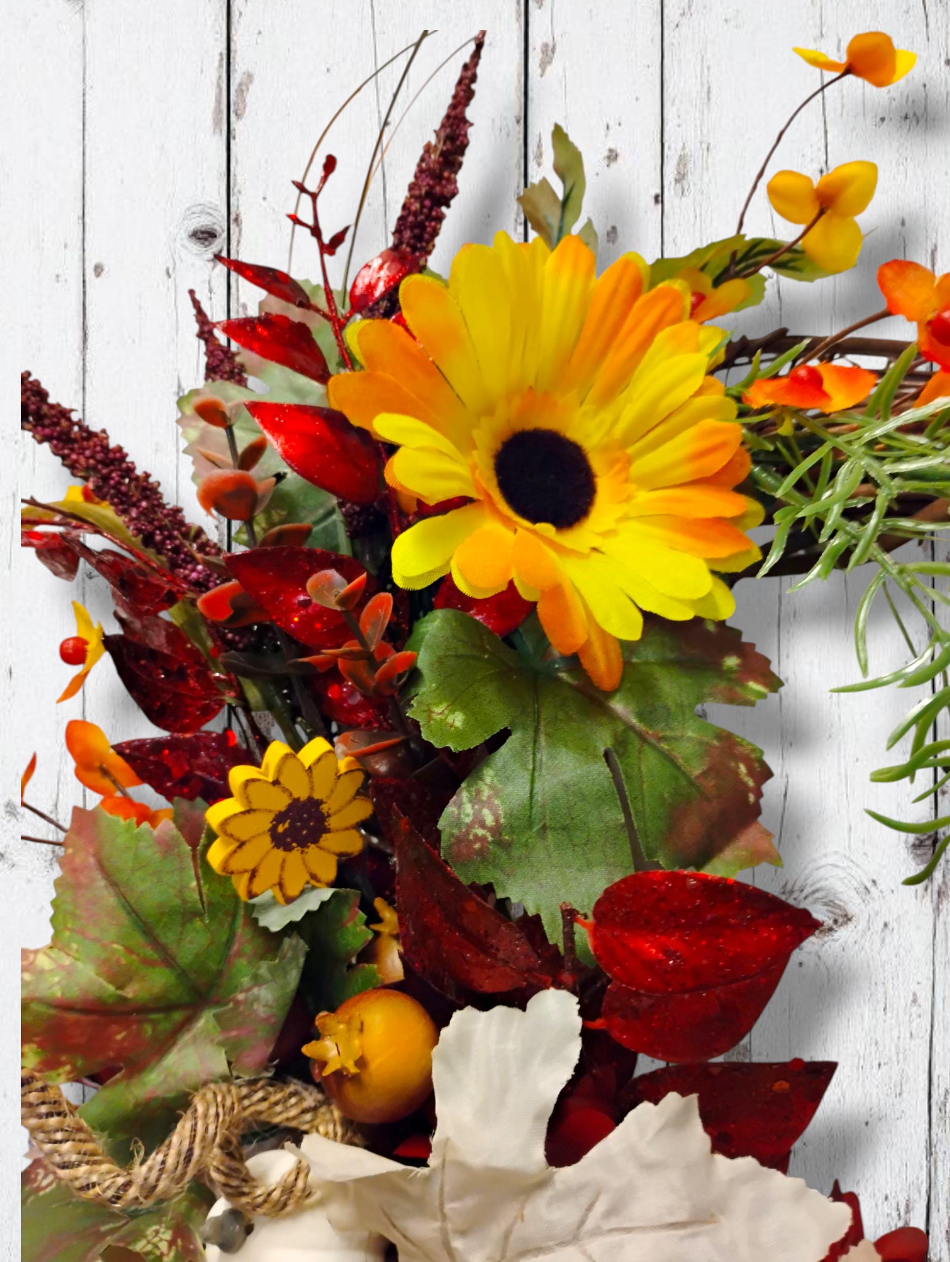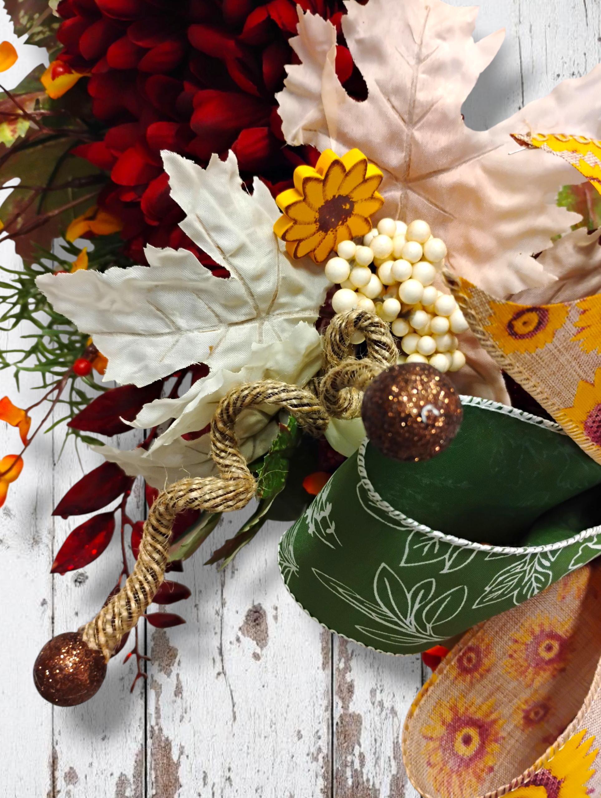 Bring the rich, cozy warmth of fall to your front door with this stunning jewel-toned grapevine wreath. Featuring deep reds, golden yellows, lush greenery, white pumpkins, yellow sunflowers and lifelike bittersweet berries, this wreath captures the essence of autumn in a bold and elegant way. Created on a natural grapevine base and arranged in a flowing crescent style, it’s perfect for September through Thanksgiving. It's topped off with a gorgeous green and sunflower fluffy bow!Hang it on your front door, above a mantle, or in any space that needs a touch of fall charm.