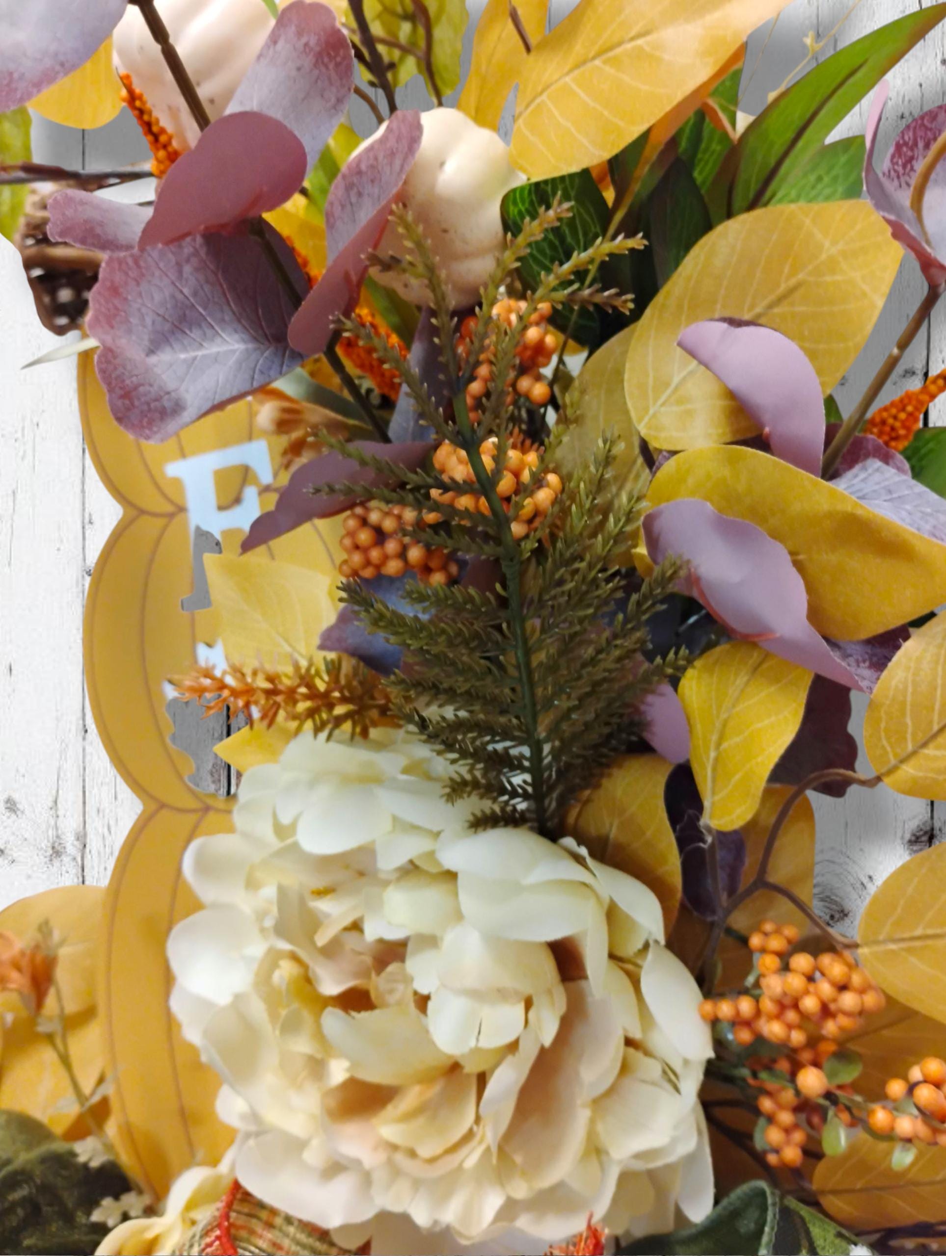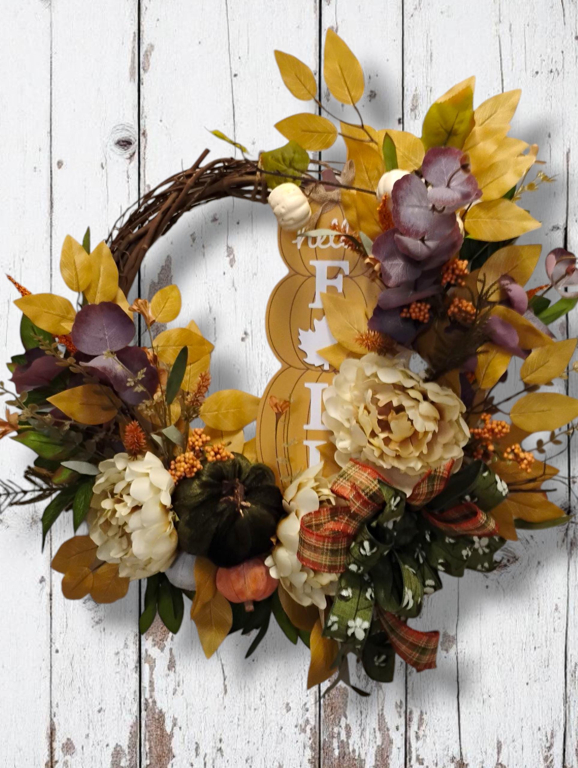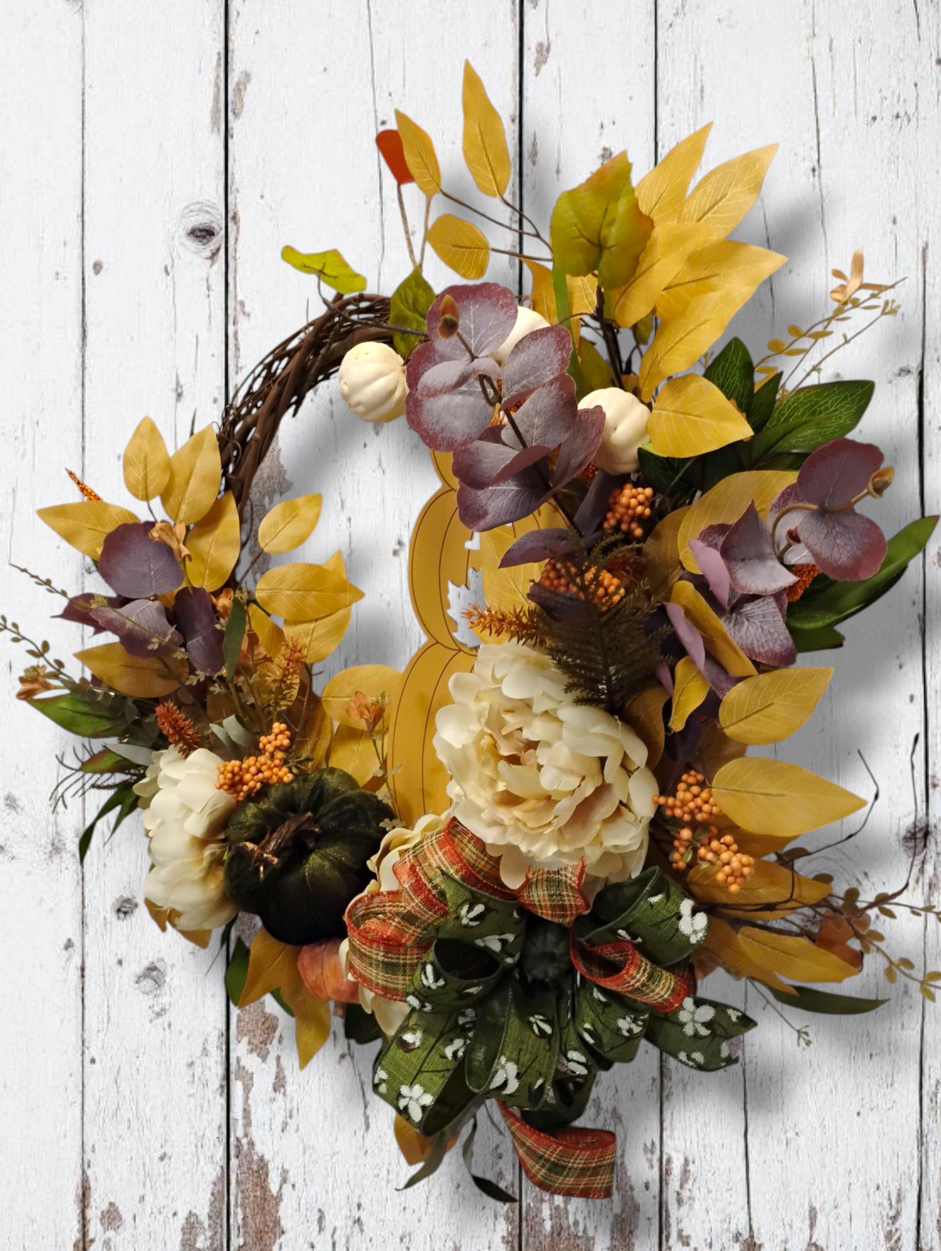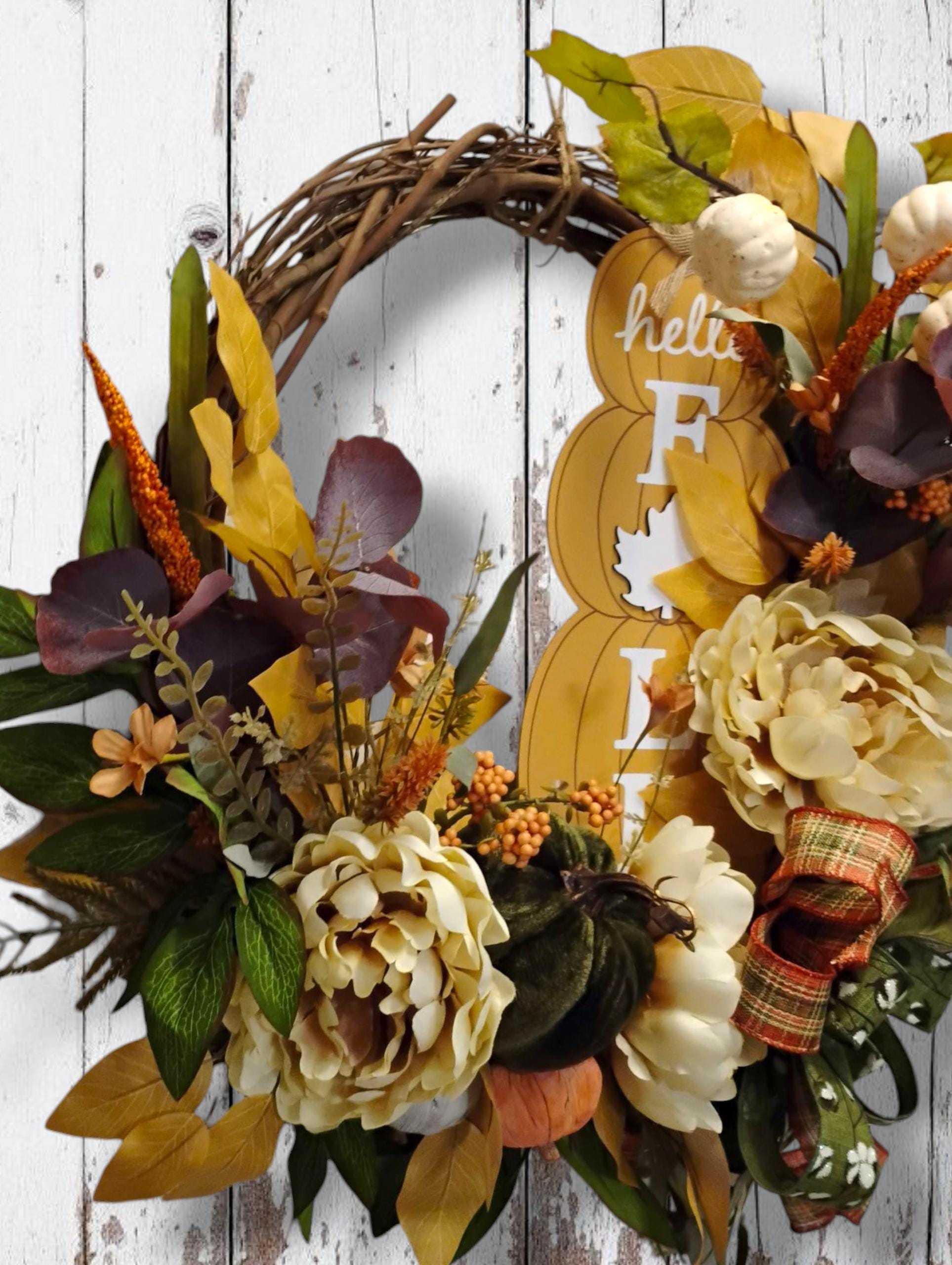 Bring the beauty of fall to your front door with this handcrafted grapevine wreath. Designed with rich golden leaves, cream peonies, rustic pumpkins in dark green and cream, and a plaid bow, this piece is full of seasonal charm. A wooden “Hello Fall” sign adds the perfect touch to welcome guests.