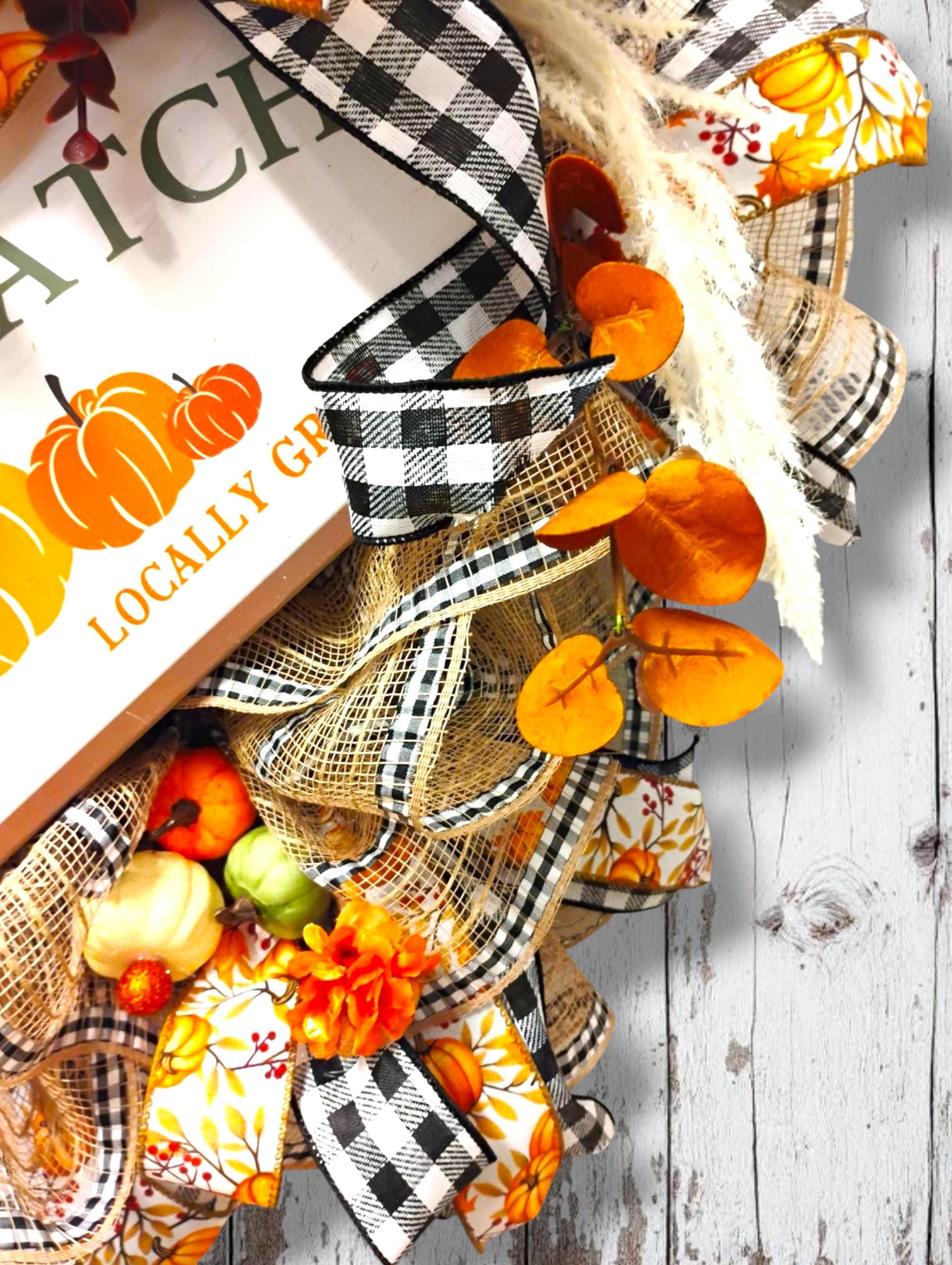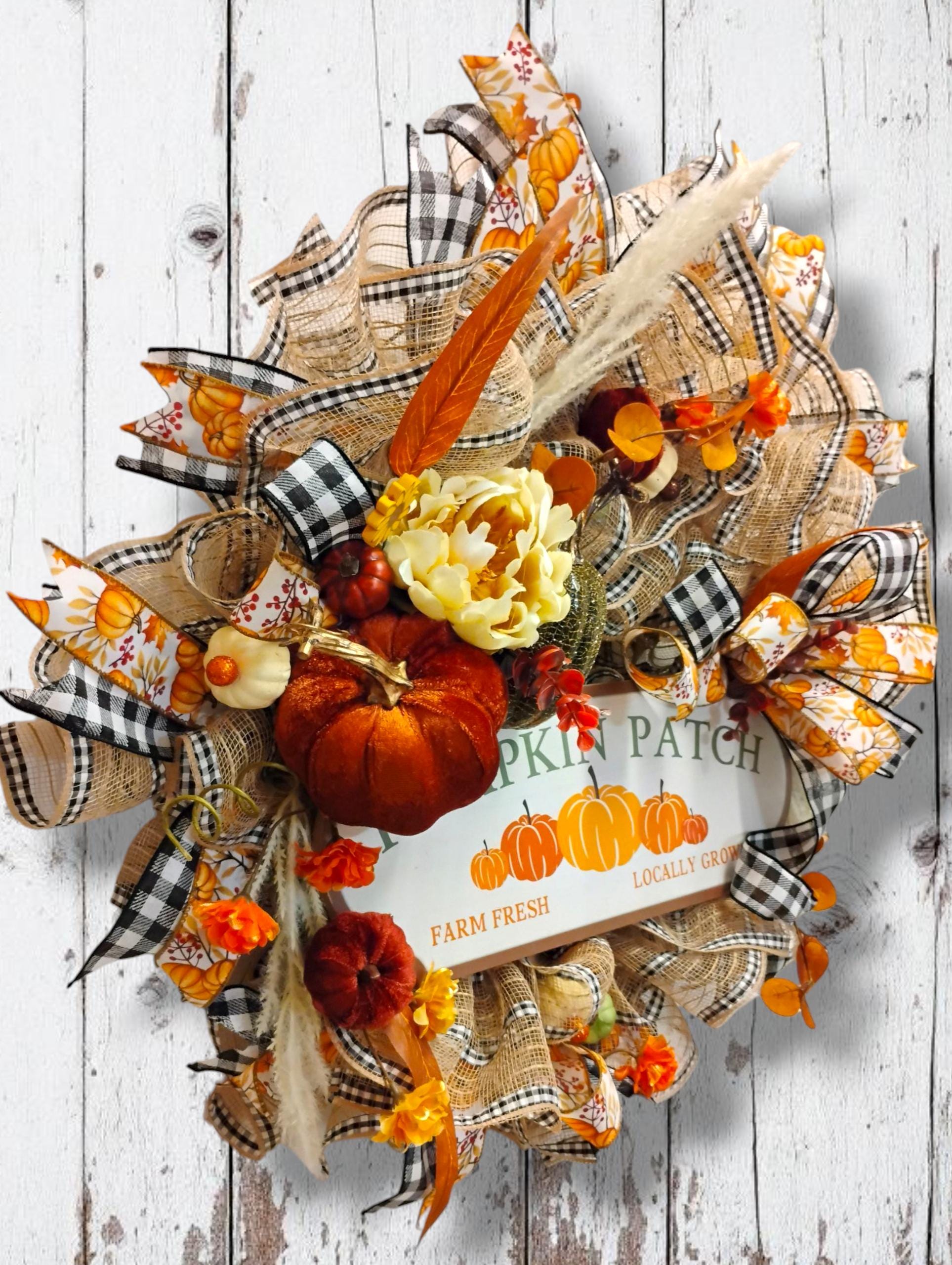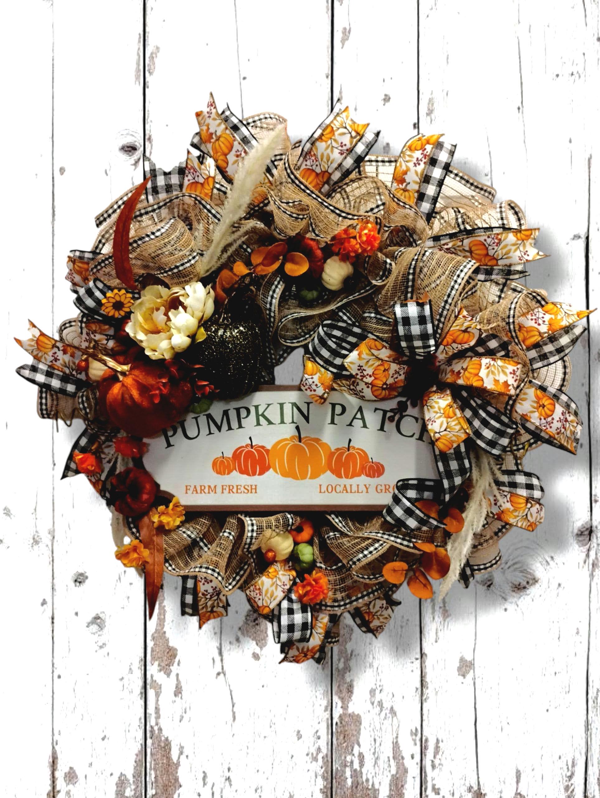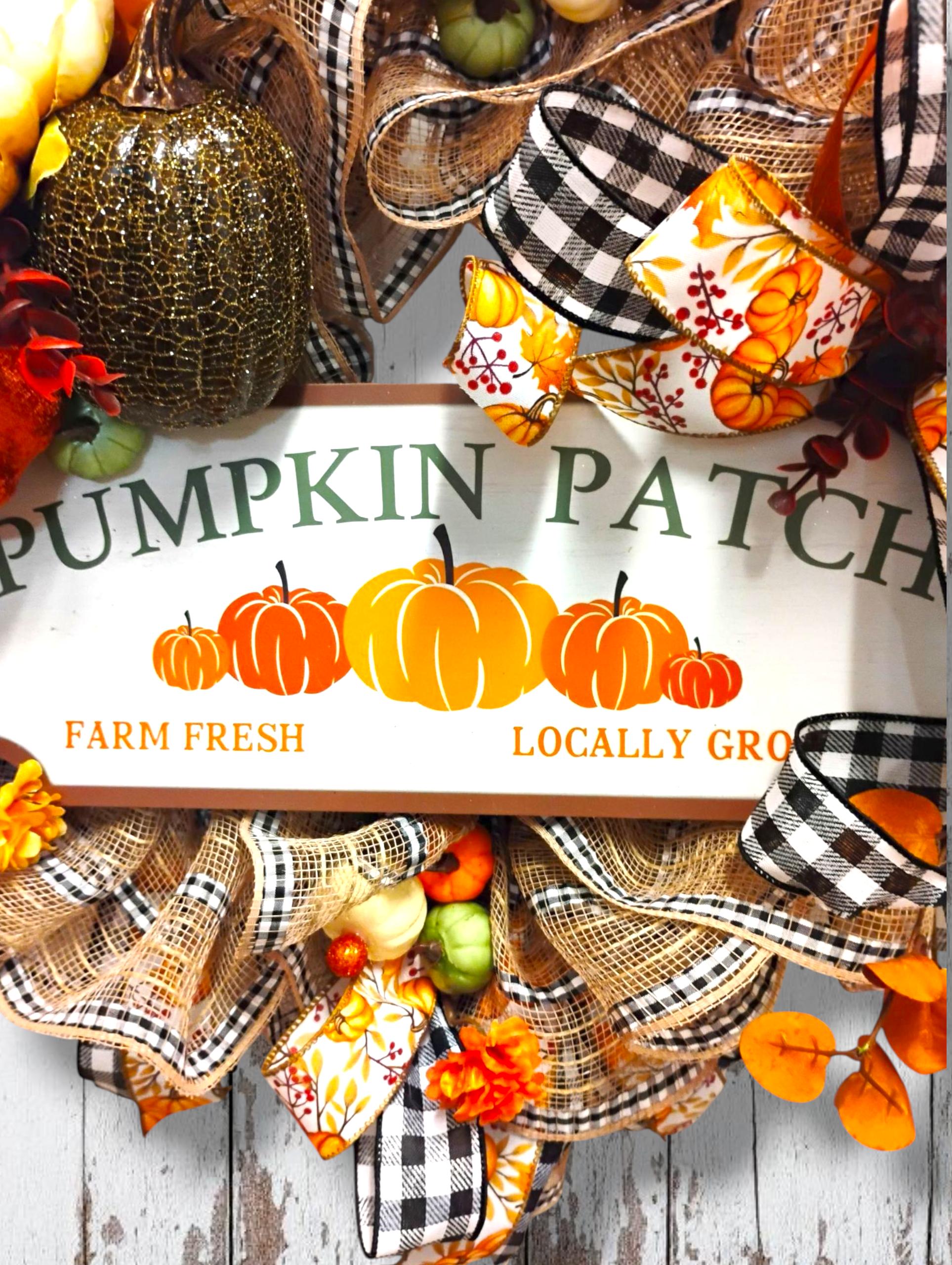 Big, bold, and perfect for fall decorating—this 26 inch farmhouse wreath makes a gorgeous first impression. Welcome guests in style this season with this handmade 26-inch fall deco mesh wreath! Bursting with autumn charm, this wreath features a Pumpkin Patch sign, layered mesh, buffalo check and pumpkin-print ribbons, faux florals, and mini pumpkins that give it a full and festive look.