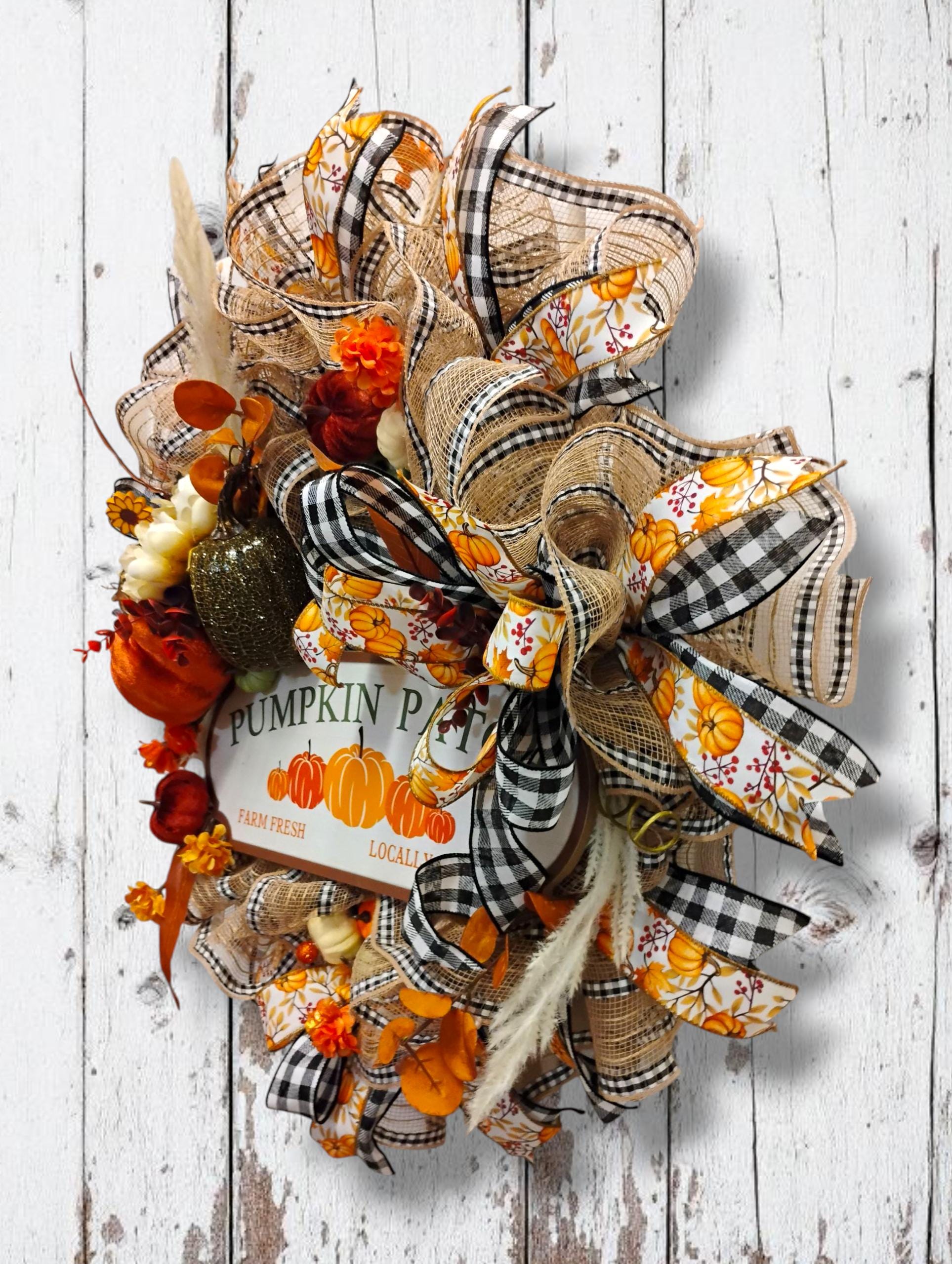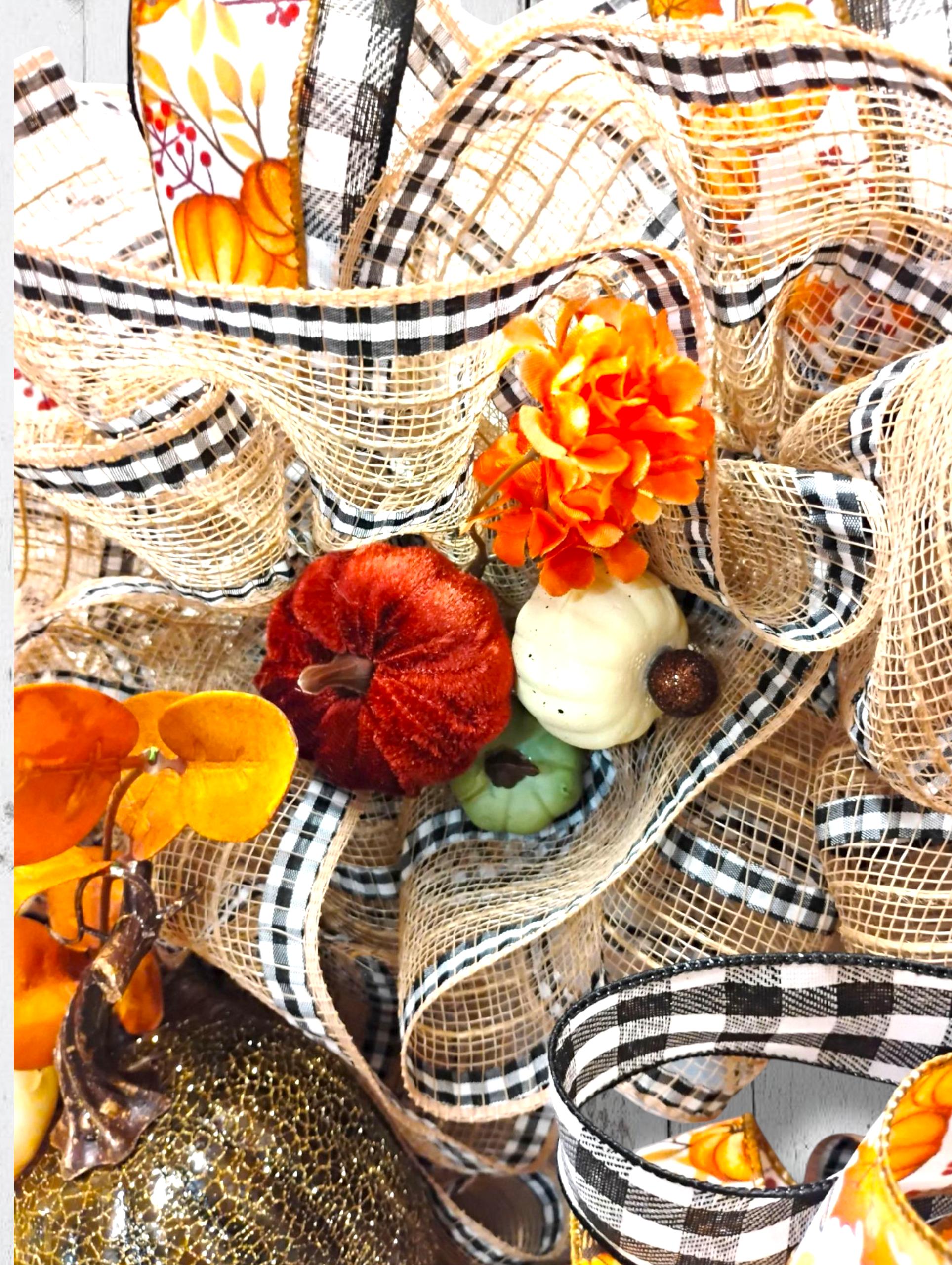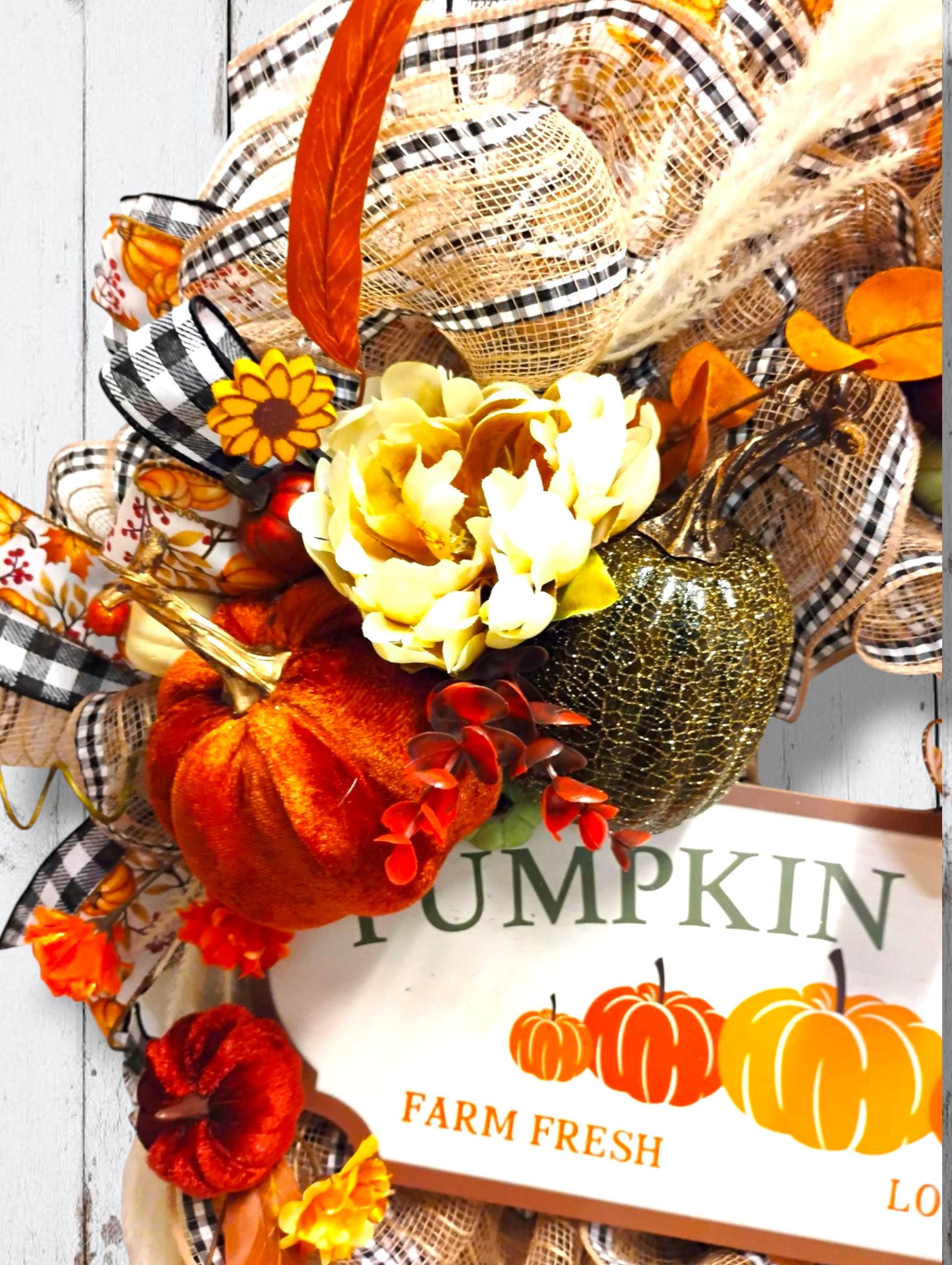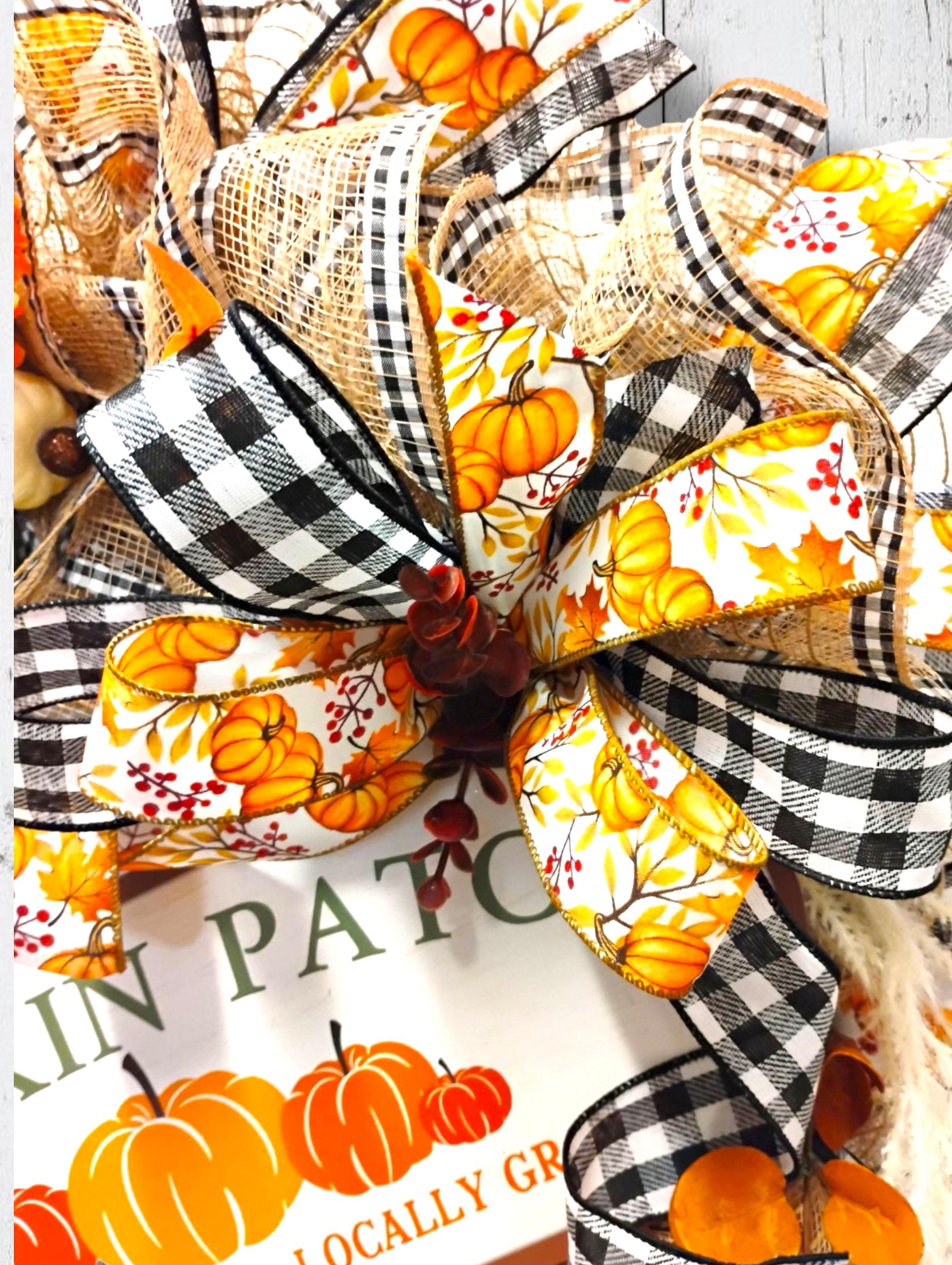 Big, bold, and perfect for fall decorating—this 26 inch farmhouse wreath makes a gorgeous first impression. Welcome guests in style this season with this handmade 26-inch fall deco mesh wreath! Bursting with autumn charm, this wreath features a Pumpkin Patch sign, layered mesh, buffalo check and pumpkin-print ribbons, faux florals, and mini pumpkins that give it a full and festive look.