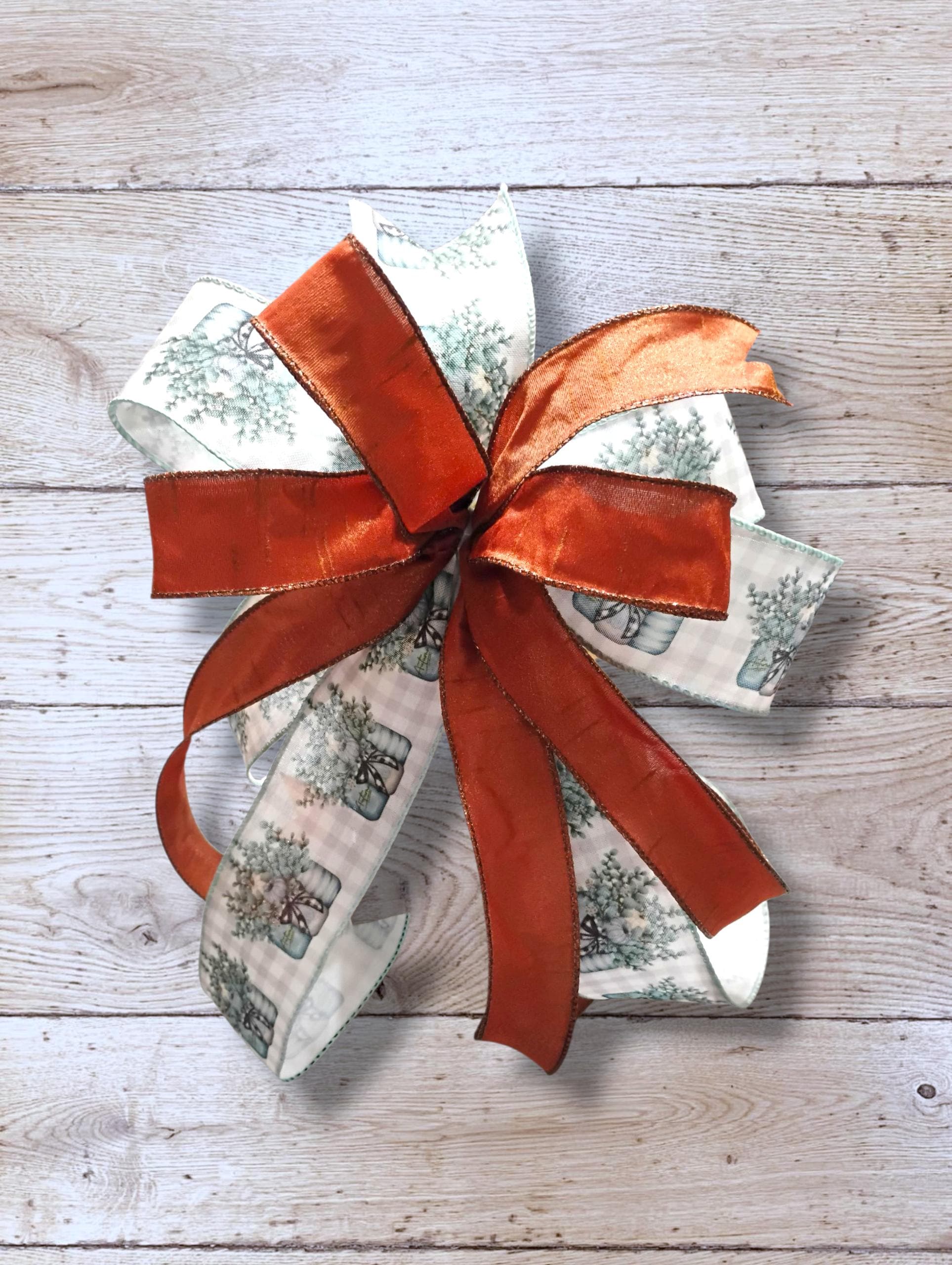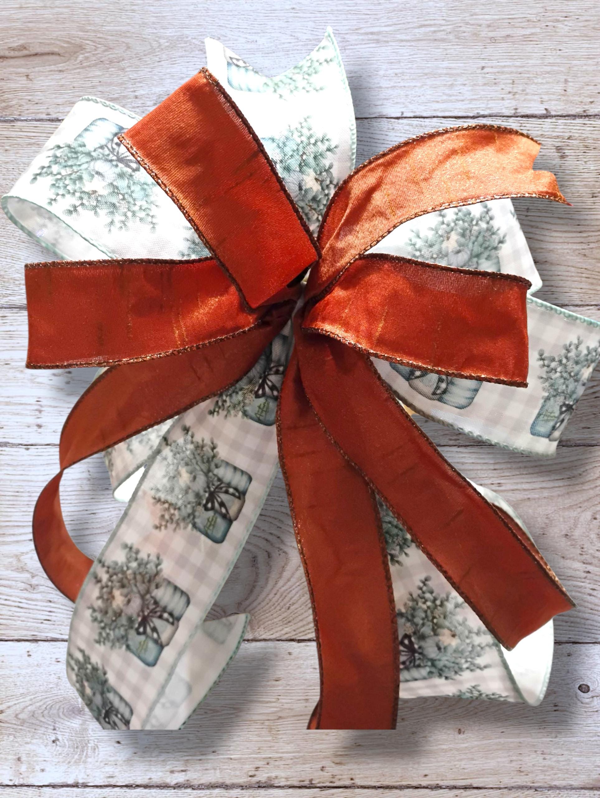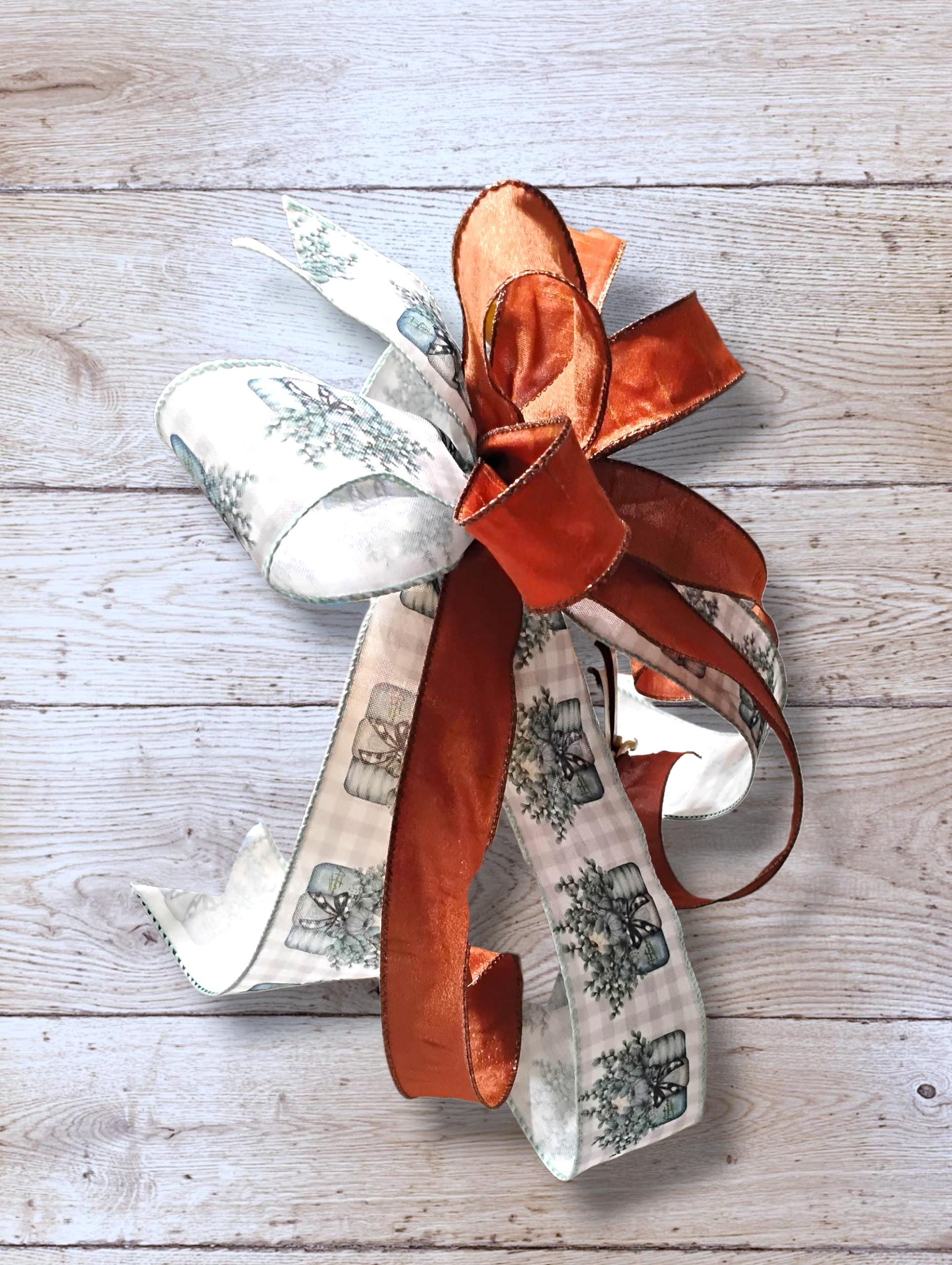 I made this one with two wired ribbons: one features a pretty mason jar floral print with a soft check background, and the other is a gorgeous copper rust colored shimmer that really pops. Both ribbons are wired, so you can easily fluff it back up after shipping or adjust the loops however you like.