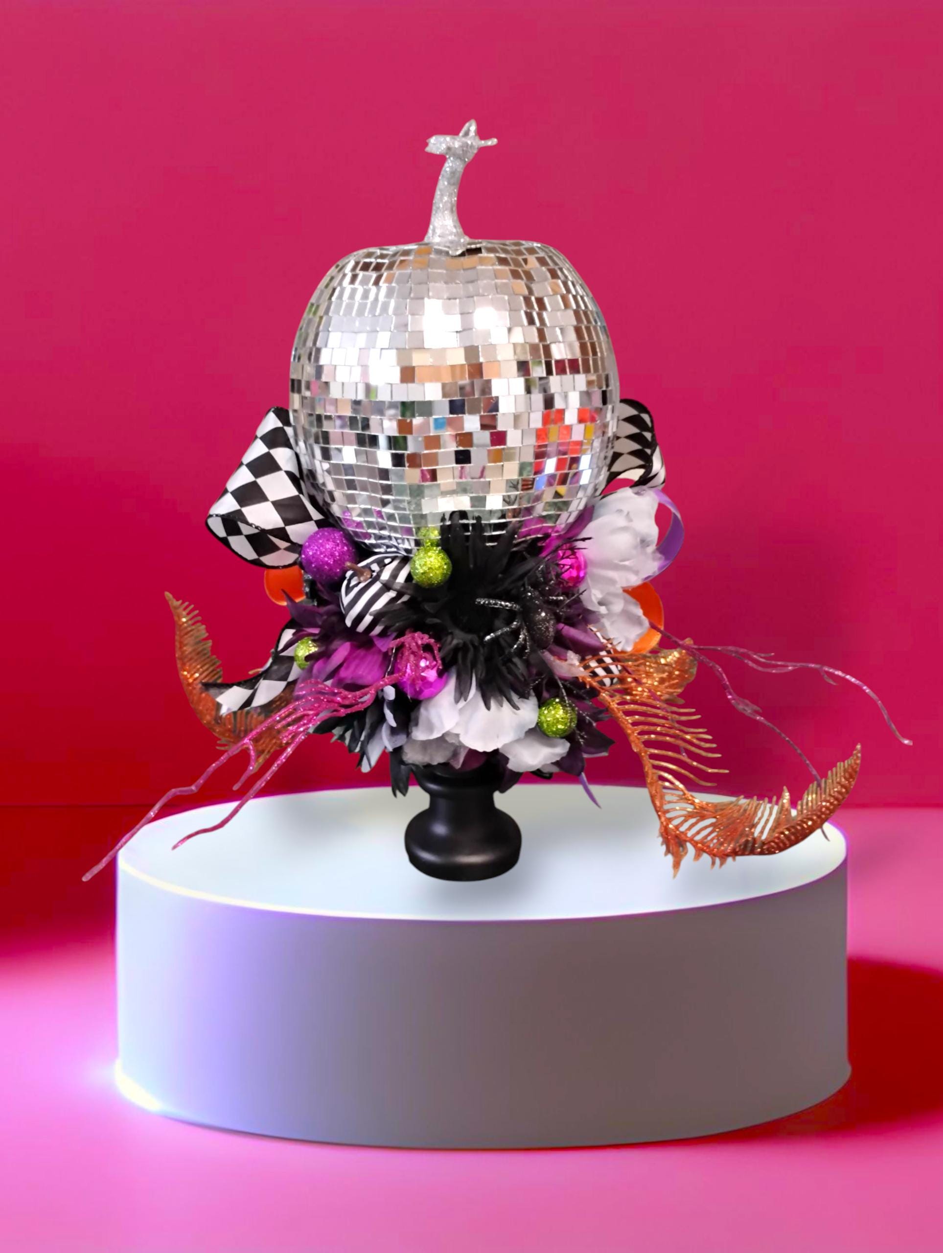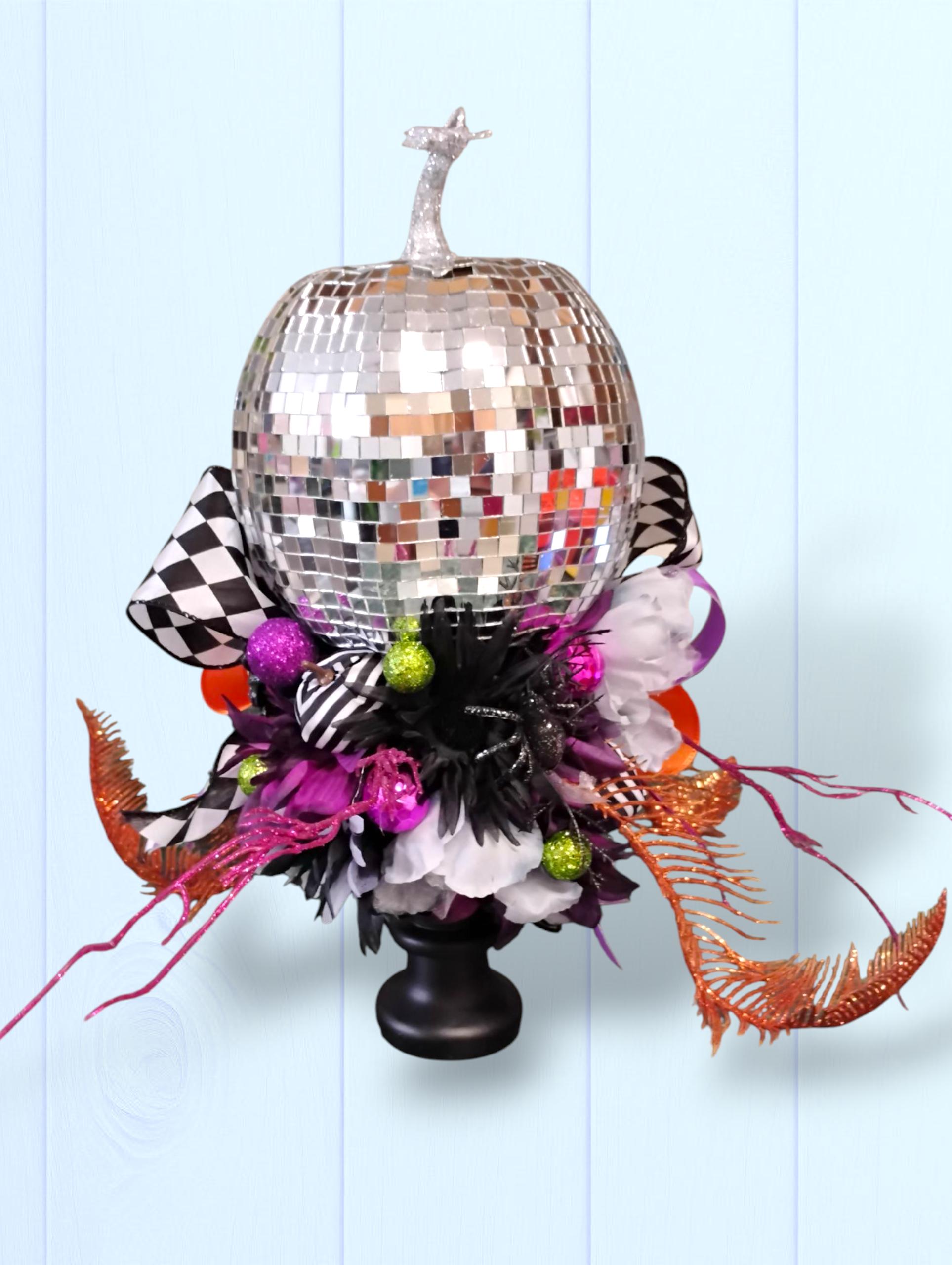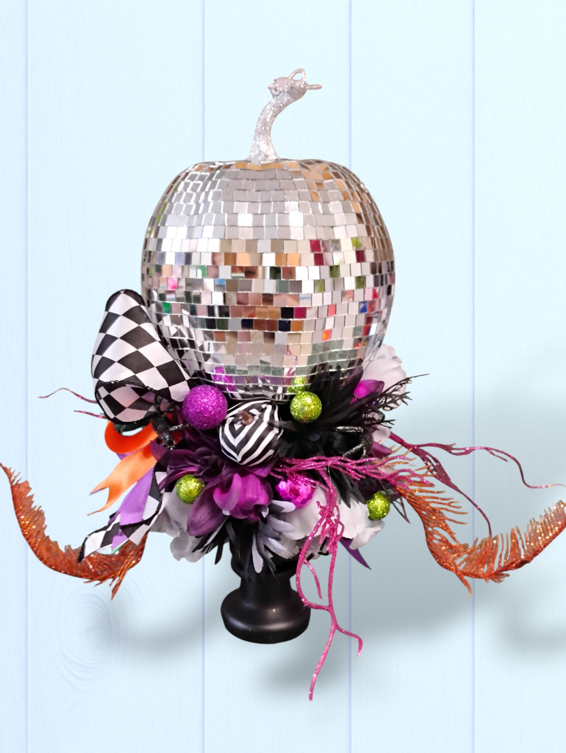 This one-of-a-kind Disco Pumpkin Halloween Centerpiece is the perfect blend of glam and whimsy. Standing about 16 inches tall, it features a shimmering mirror-ball pumpkin as the focal point, surrounded by Halloween florals in black, purple, orange, green and stripes. Glitter accents, and seasonal ribbons finish the look. Place it on your dining table, entryway, fireplace mantle, or party buffet for a statement piece your guests won’t forget.