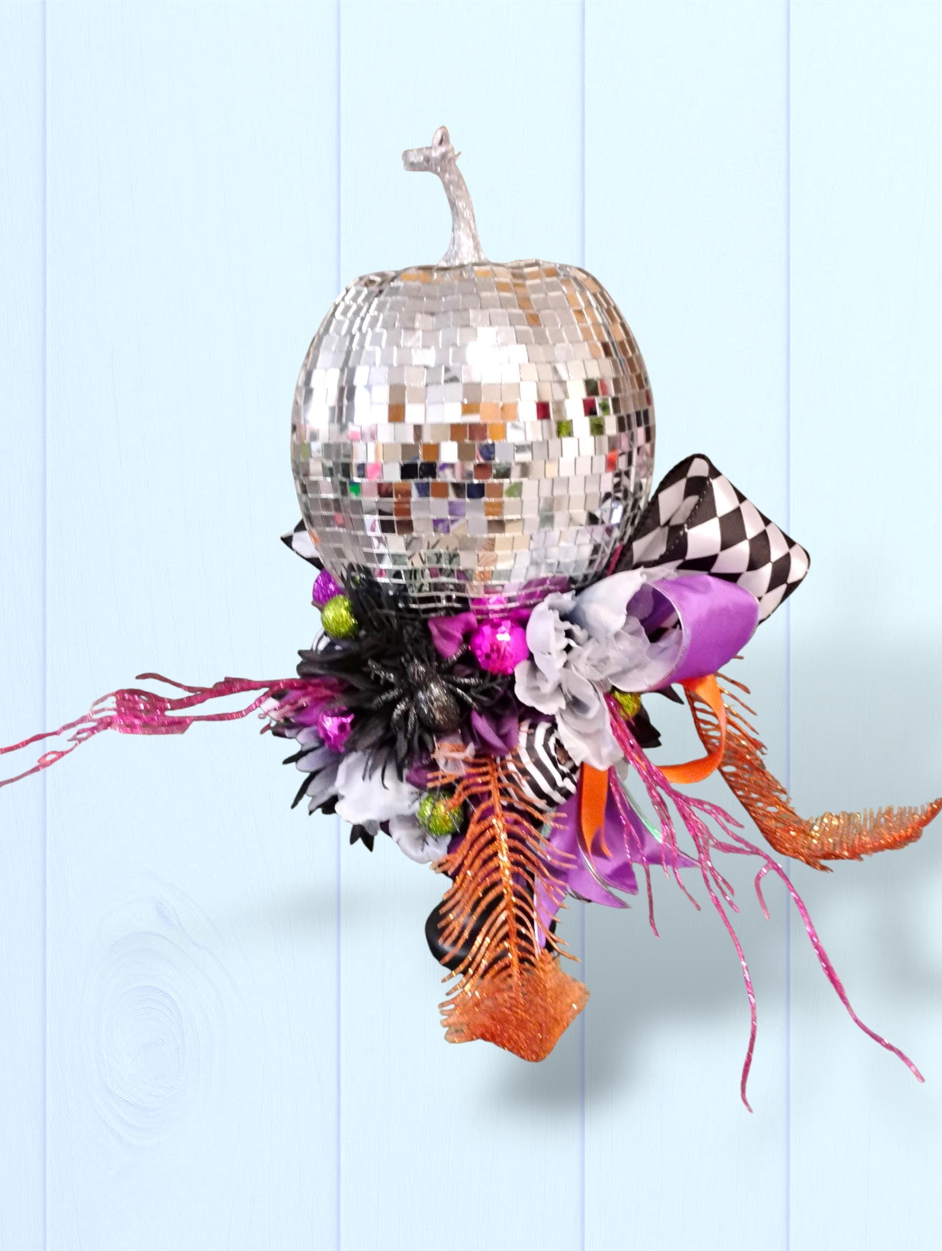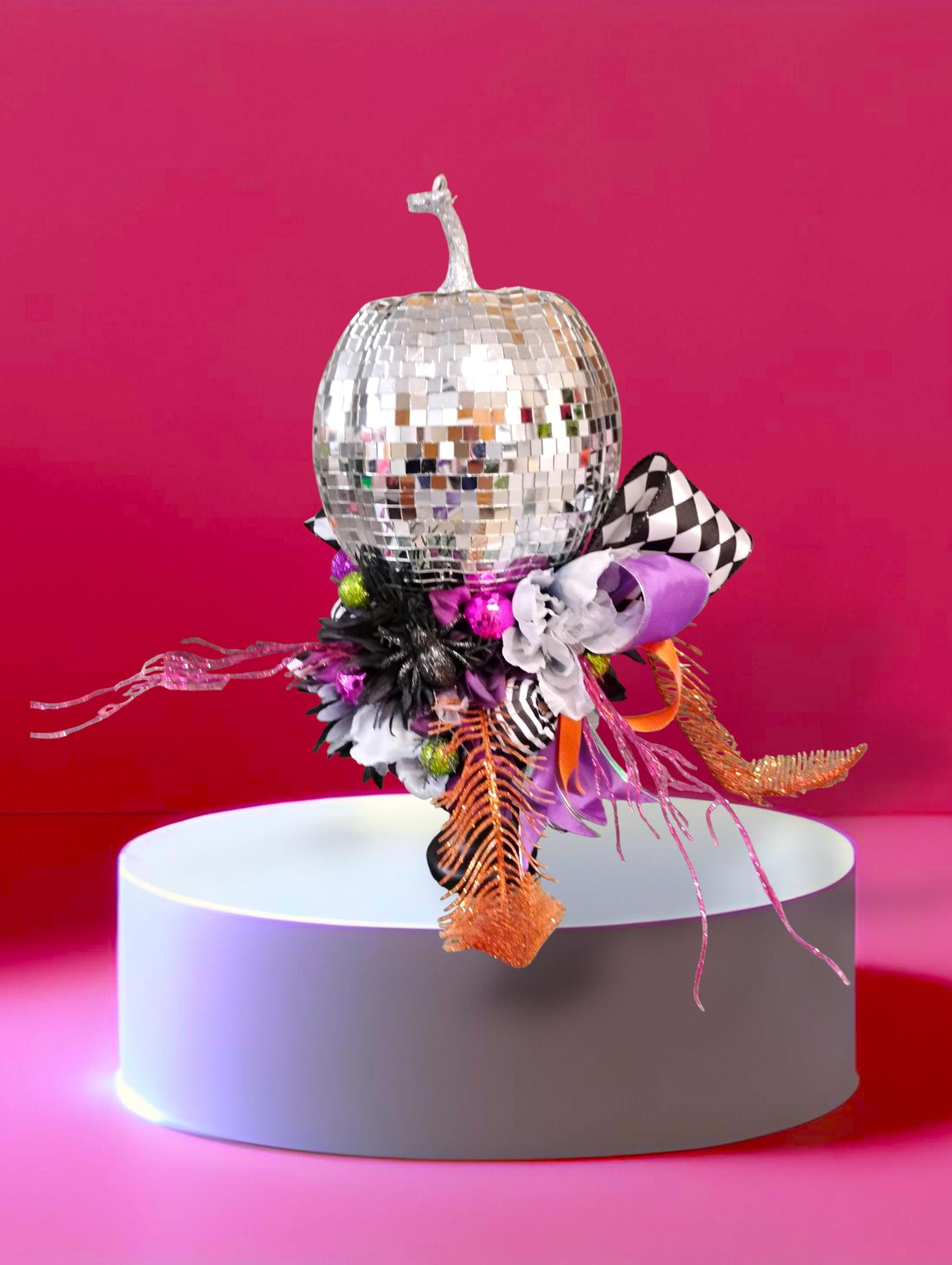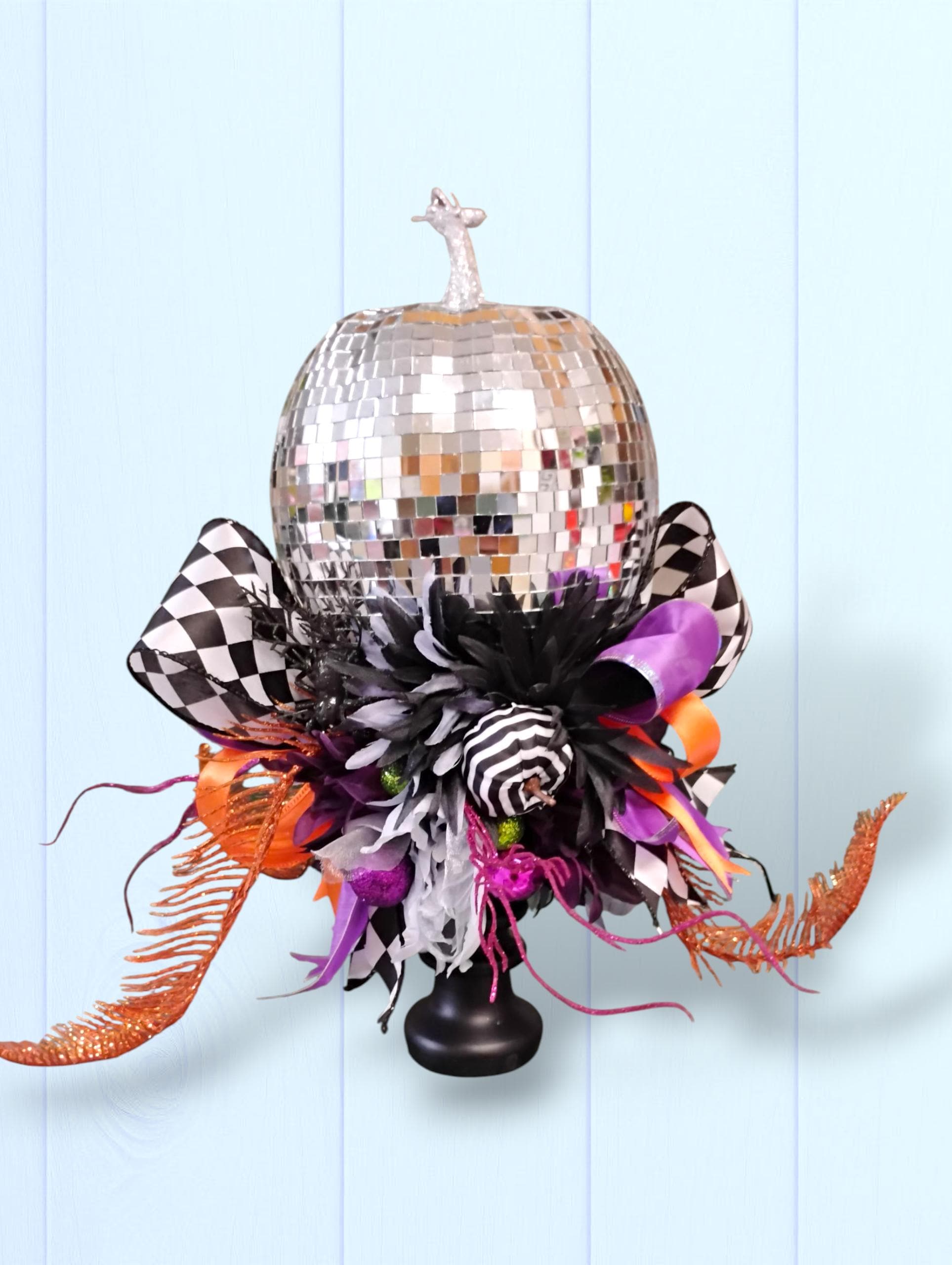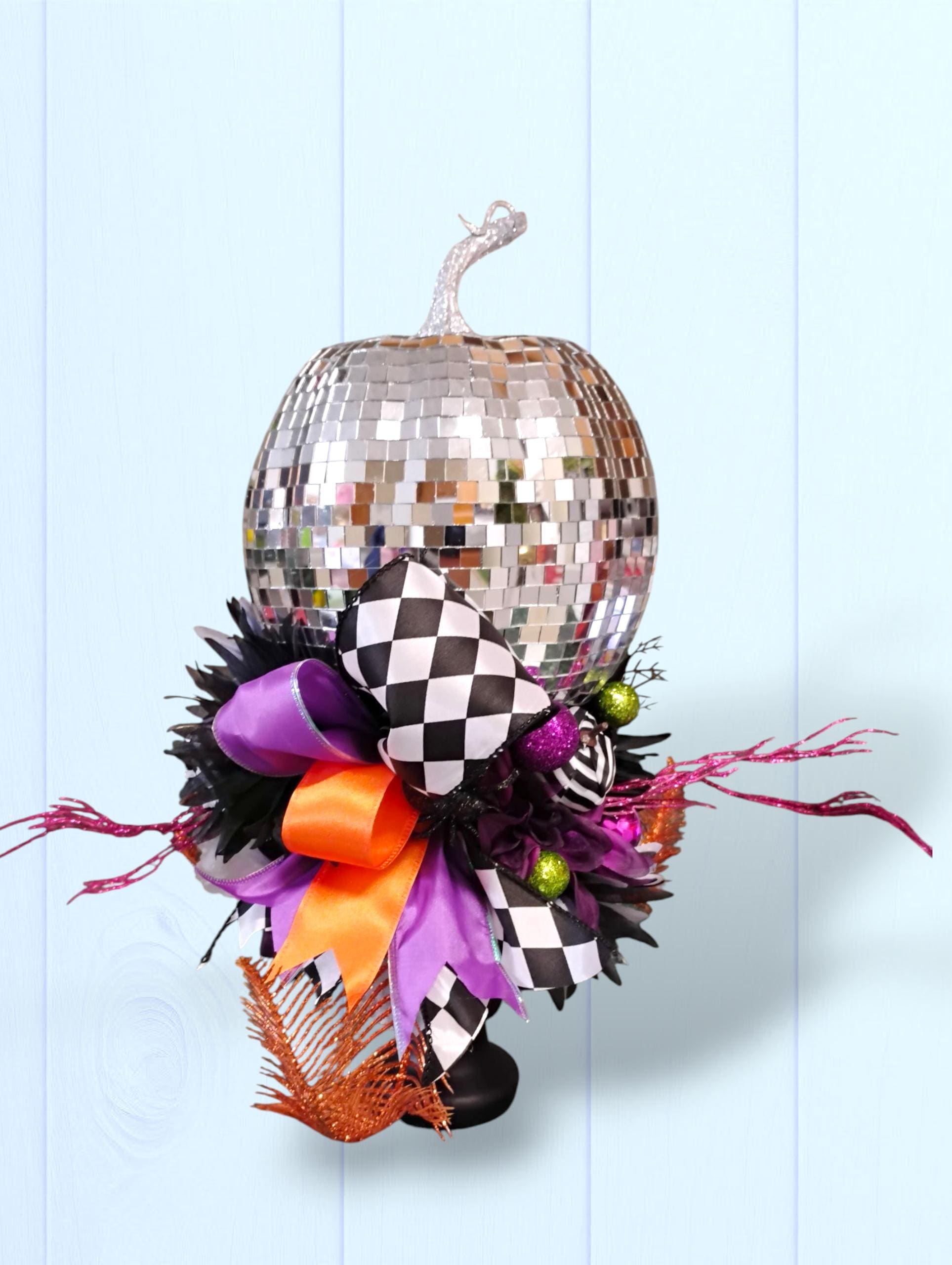 This one-of-a-kind Disco Pumpkin Halloween Centerpiece is the perfect blend of glam and whimsy. Standing about 16 inches tall, it features a shimmering mirror-ball pumpkin as the focal point, surrounded by Halloween florals in black, purple, orange, green and stripes. Glitter accents, and seasonal ribbons finish the look. Place it on your dining table, entryway, fireplace mantle, or party buffet for a statement piece your guests won’t forget.