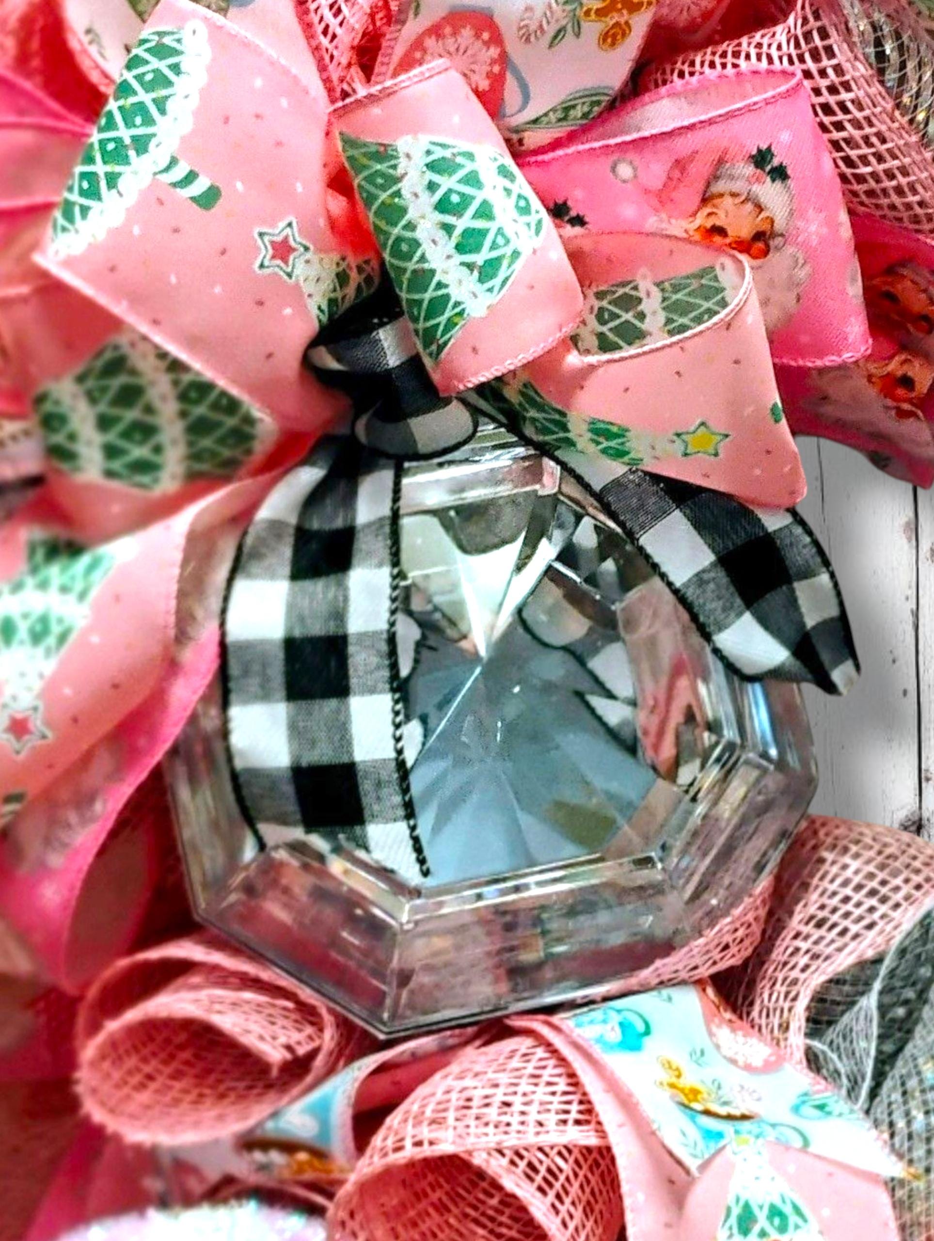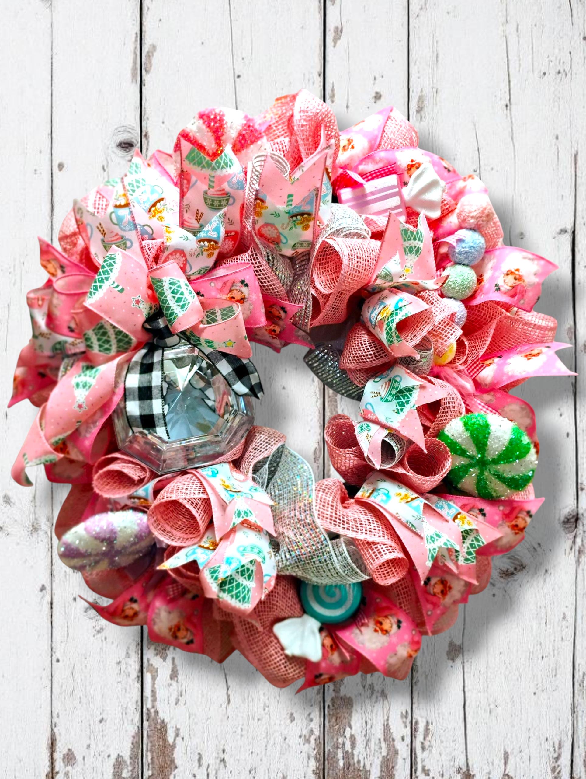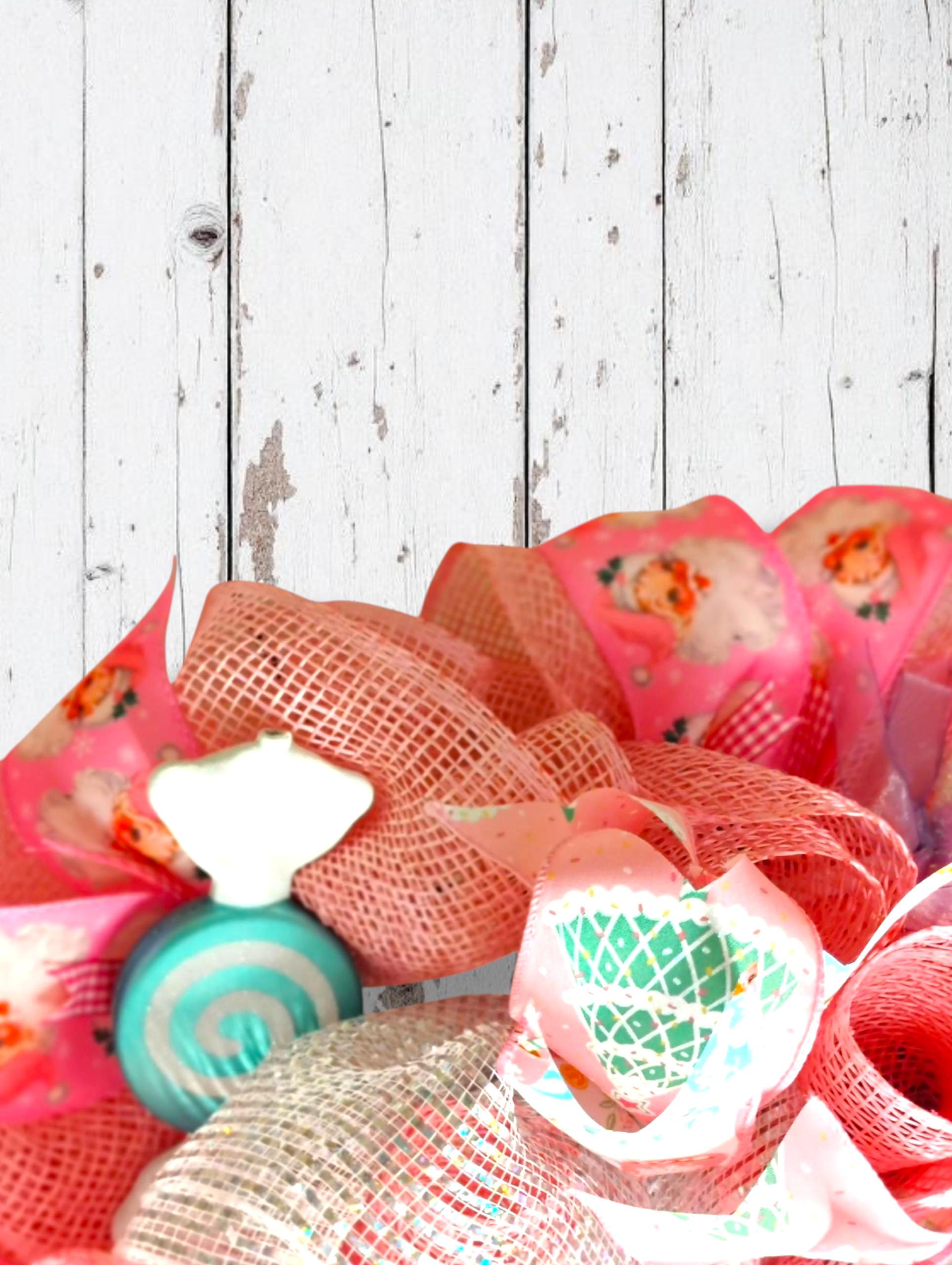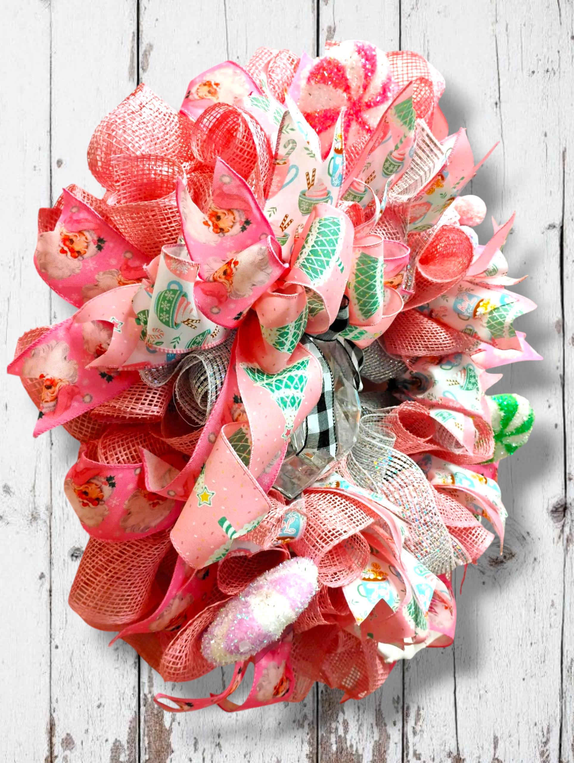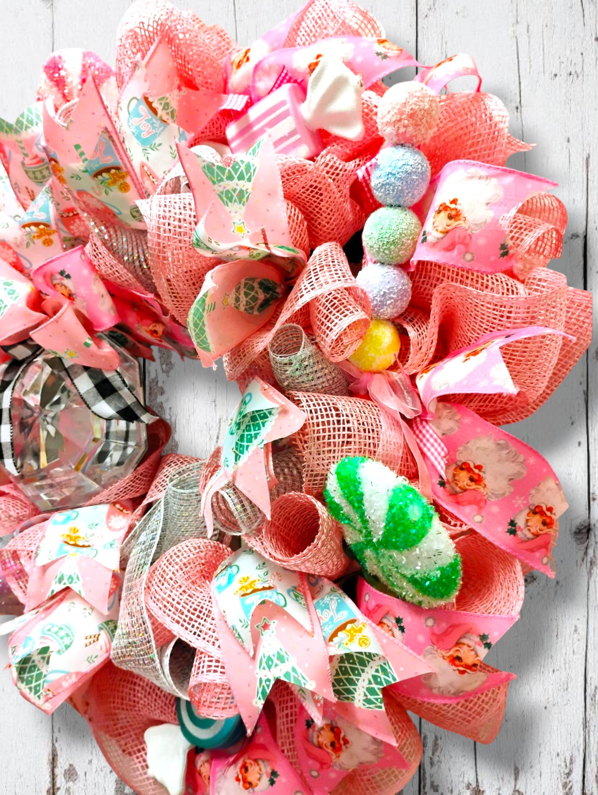 Just added! A whimsical pink Christmas wreath full of candy ornaments, Santa ribbon, and farmhouse charm. 🎄 Ready to ship! Add a touch of whimsical holiday cheer to your home with this handcrafted Pink Christmas Wreath. Designed with layers of Christmas ribbon, sparkling mesh, and candy-themed ornaments, this wreath is full of personality and color.