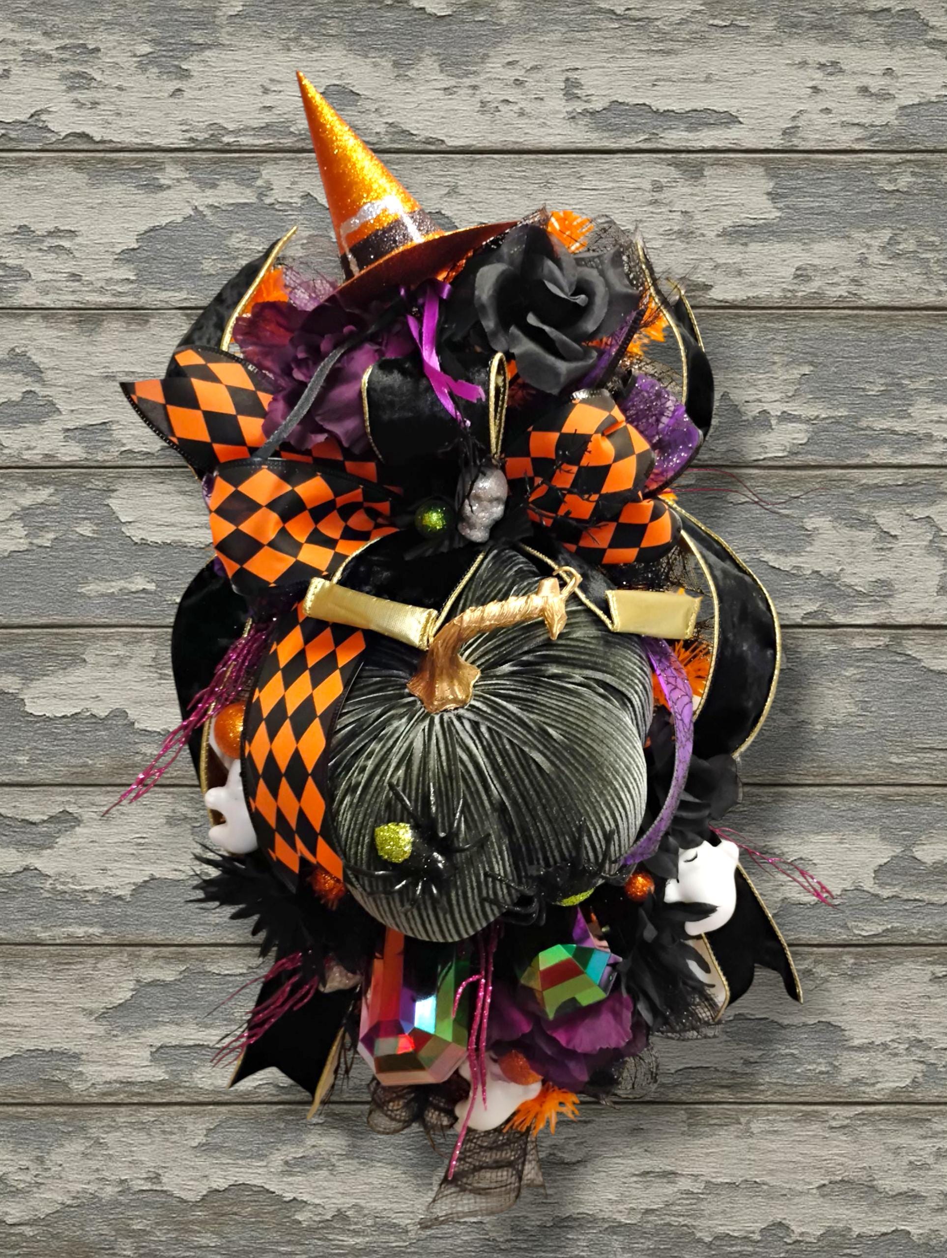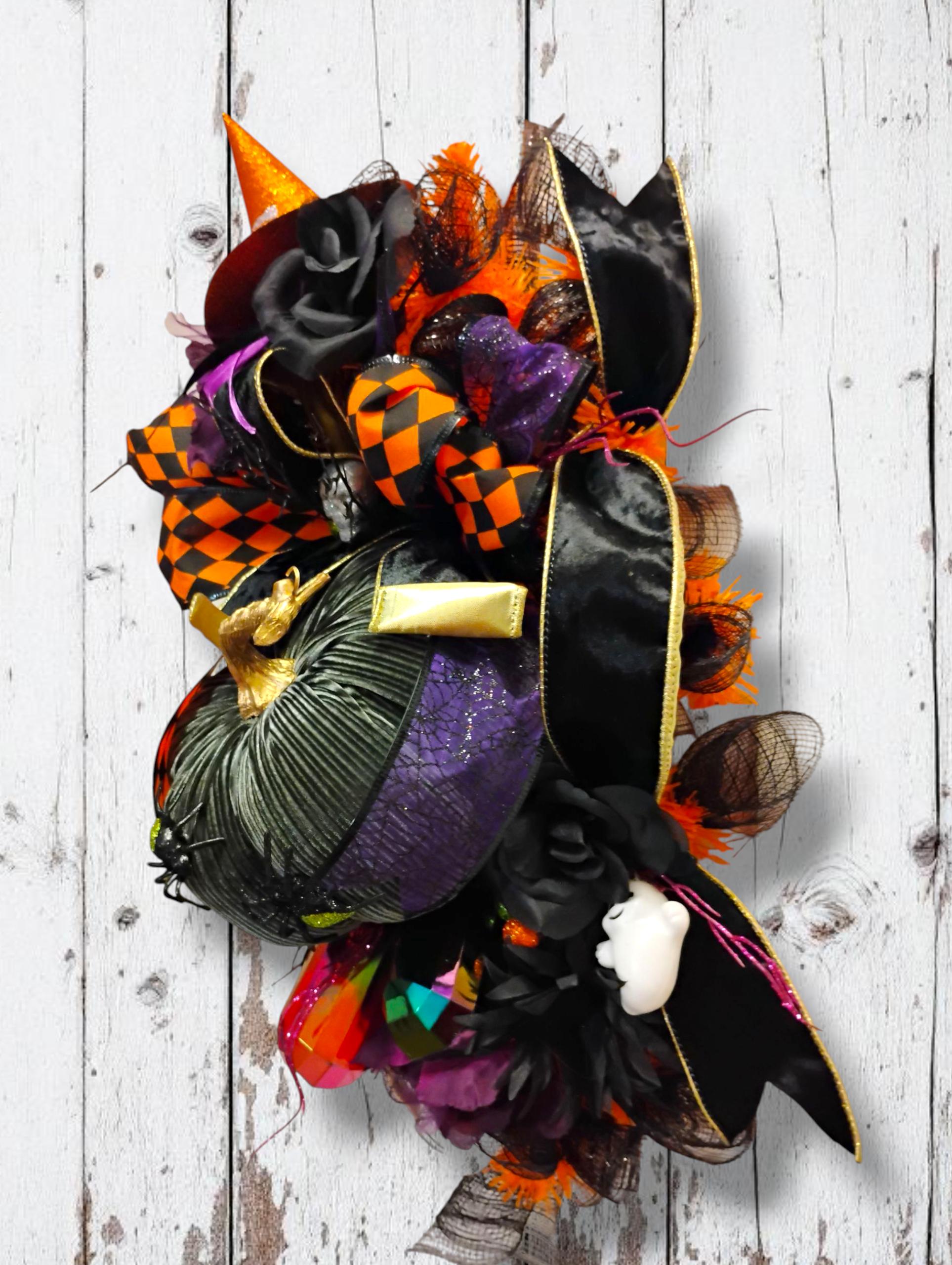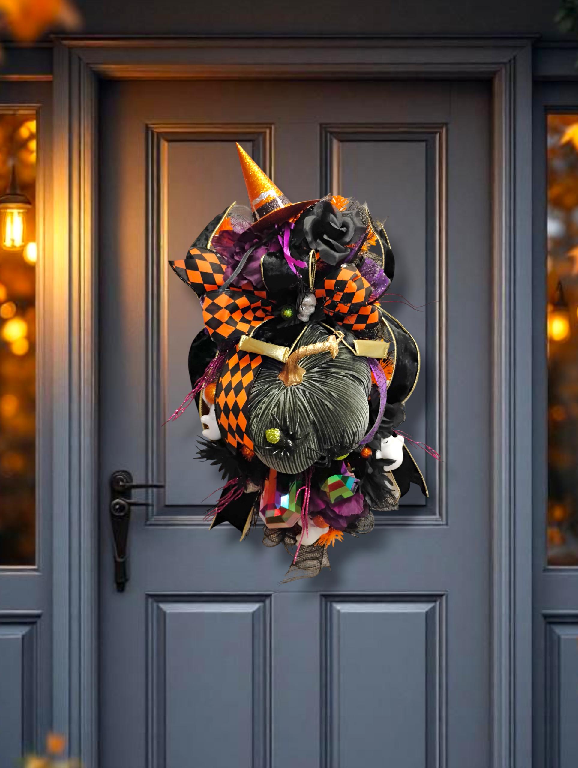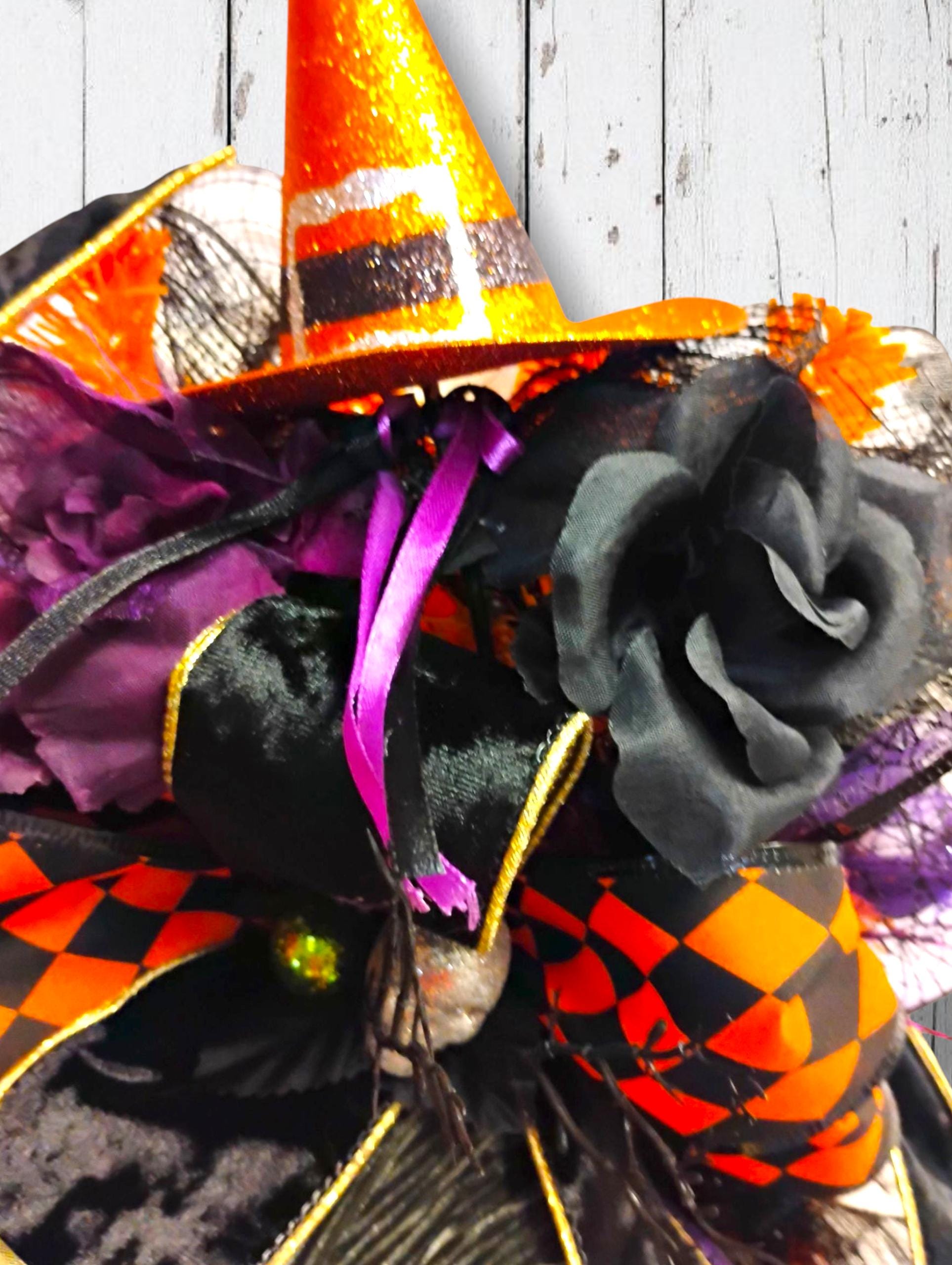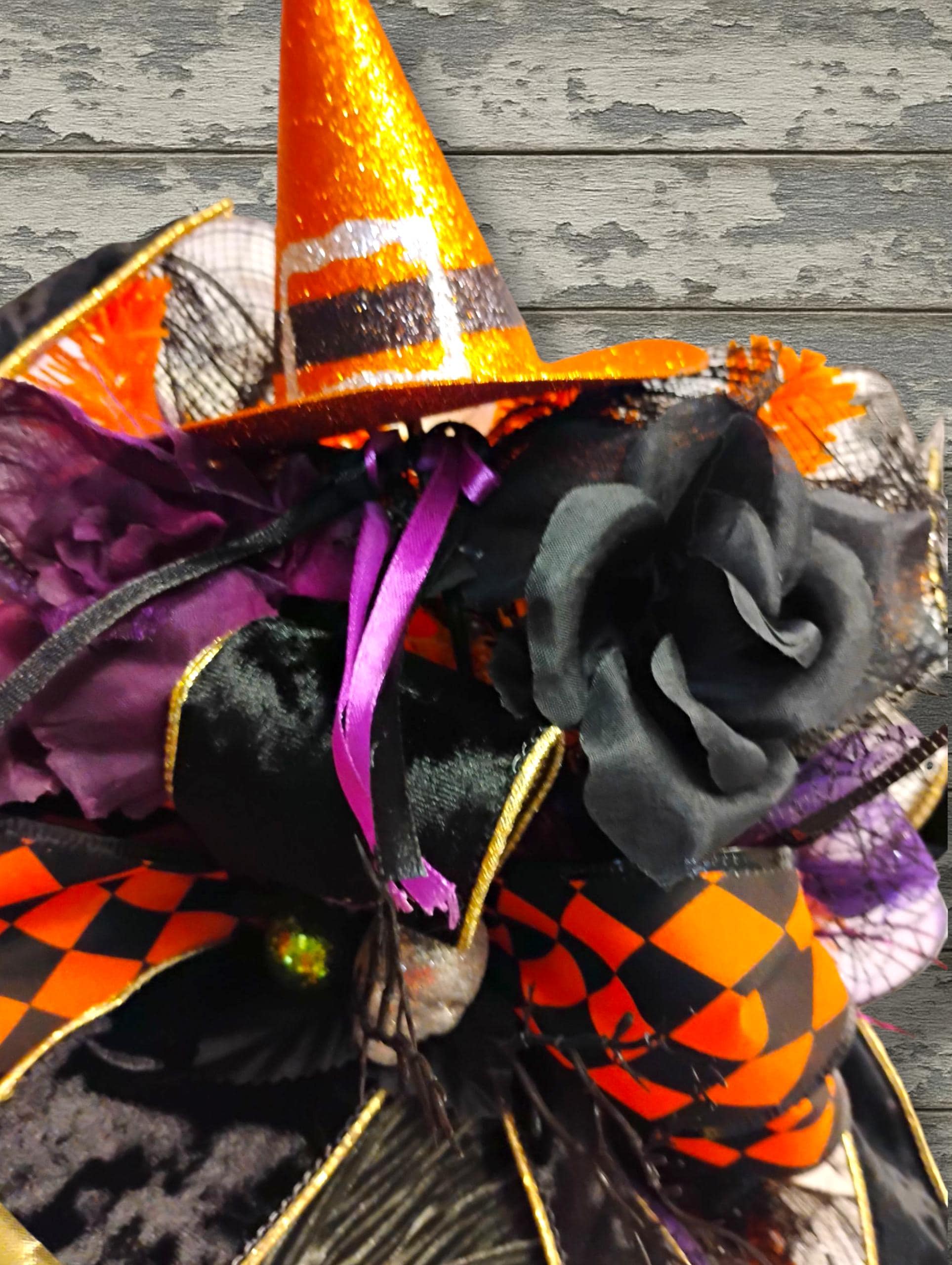 Add some spooky fun to your front door with this one-of-a-kind Halloween witch wreath! This handmade design features a velvet pumpkin, glittery orange witch hat, black roses, harlequin bows, and whimsical Halloween accents that pop against layers of black, purple, and orange. Perfect for adding bold, gothic glam flair to your home this Halloween season.