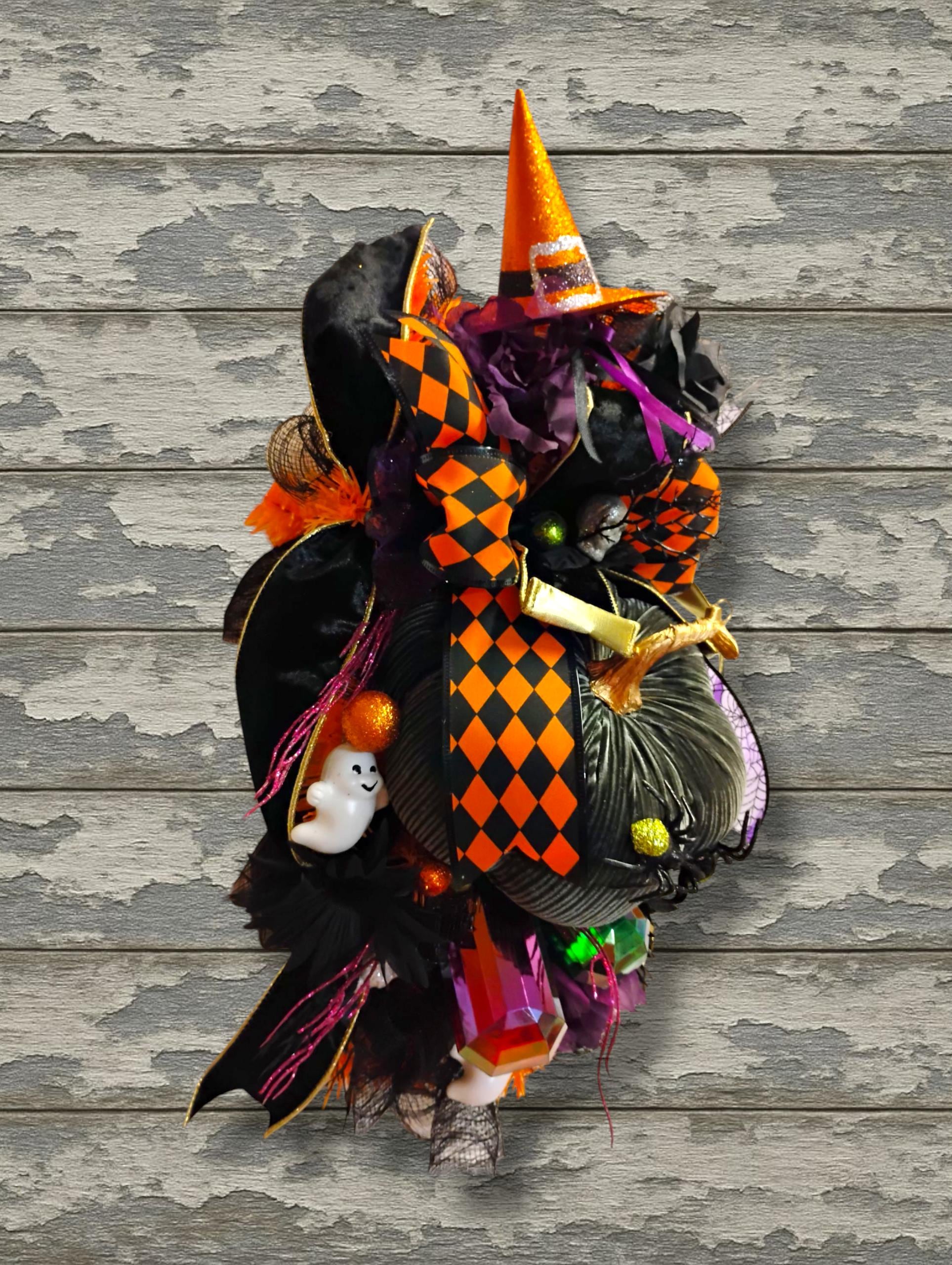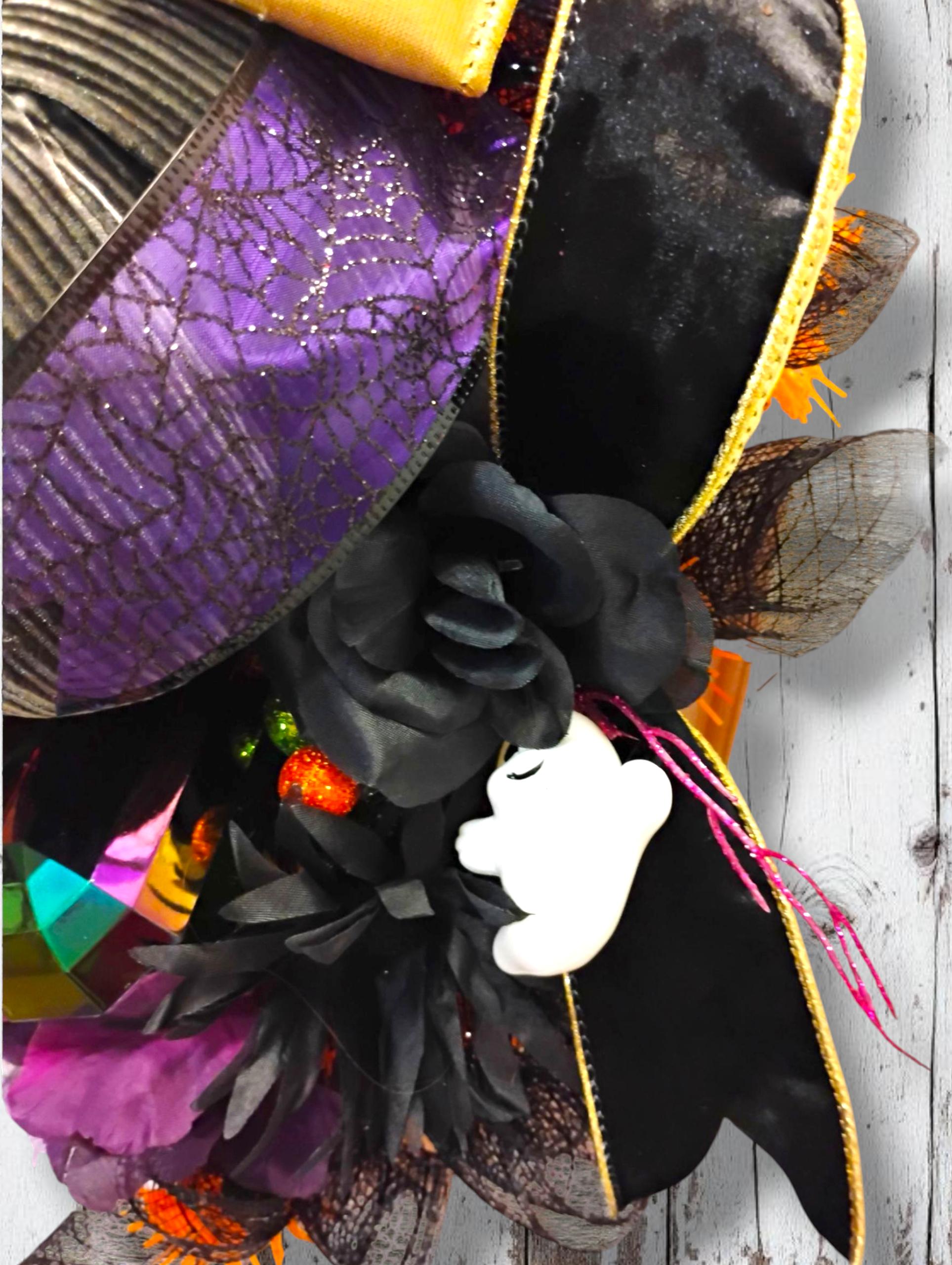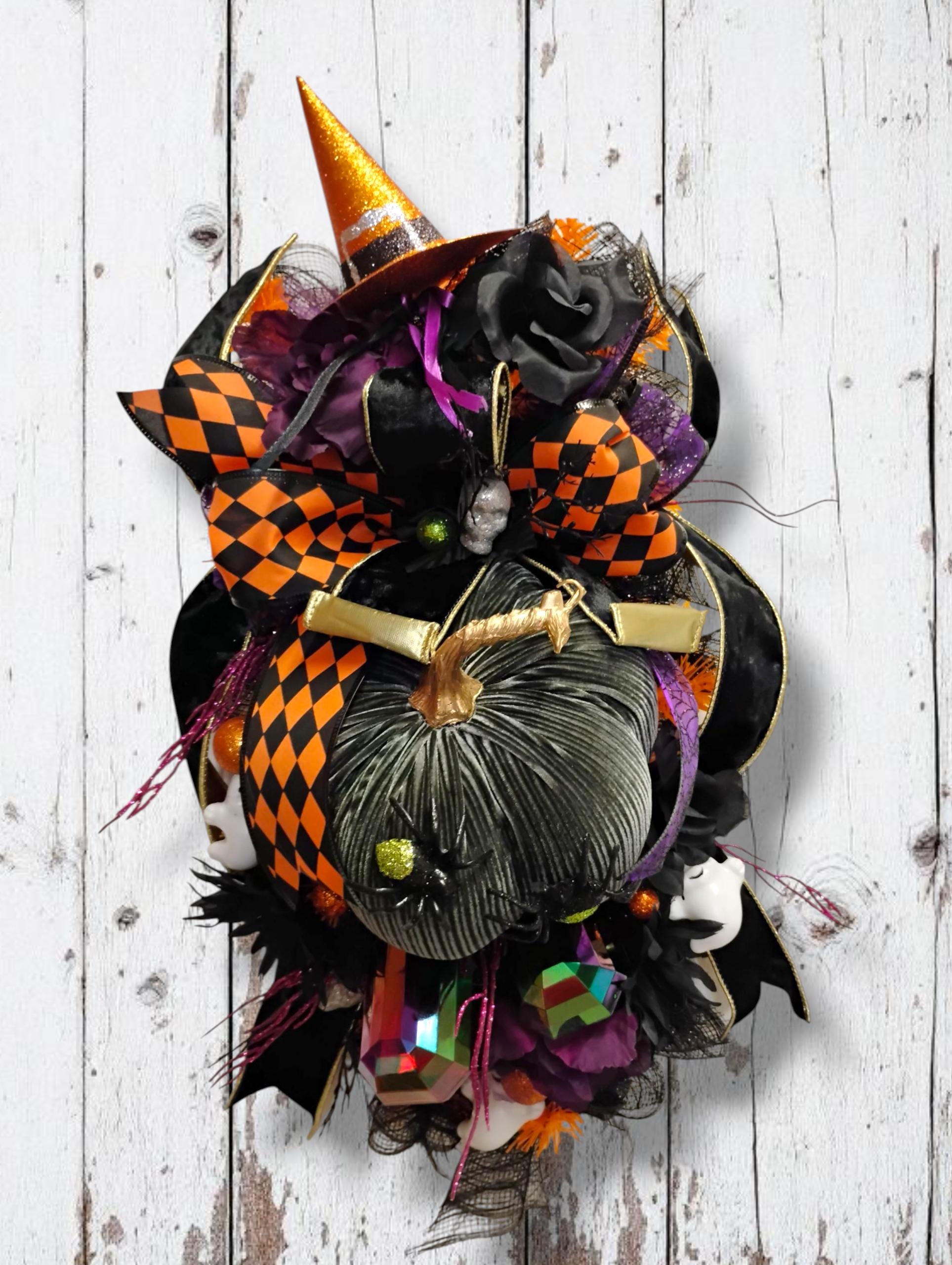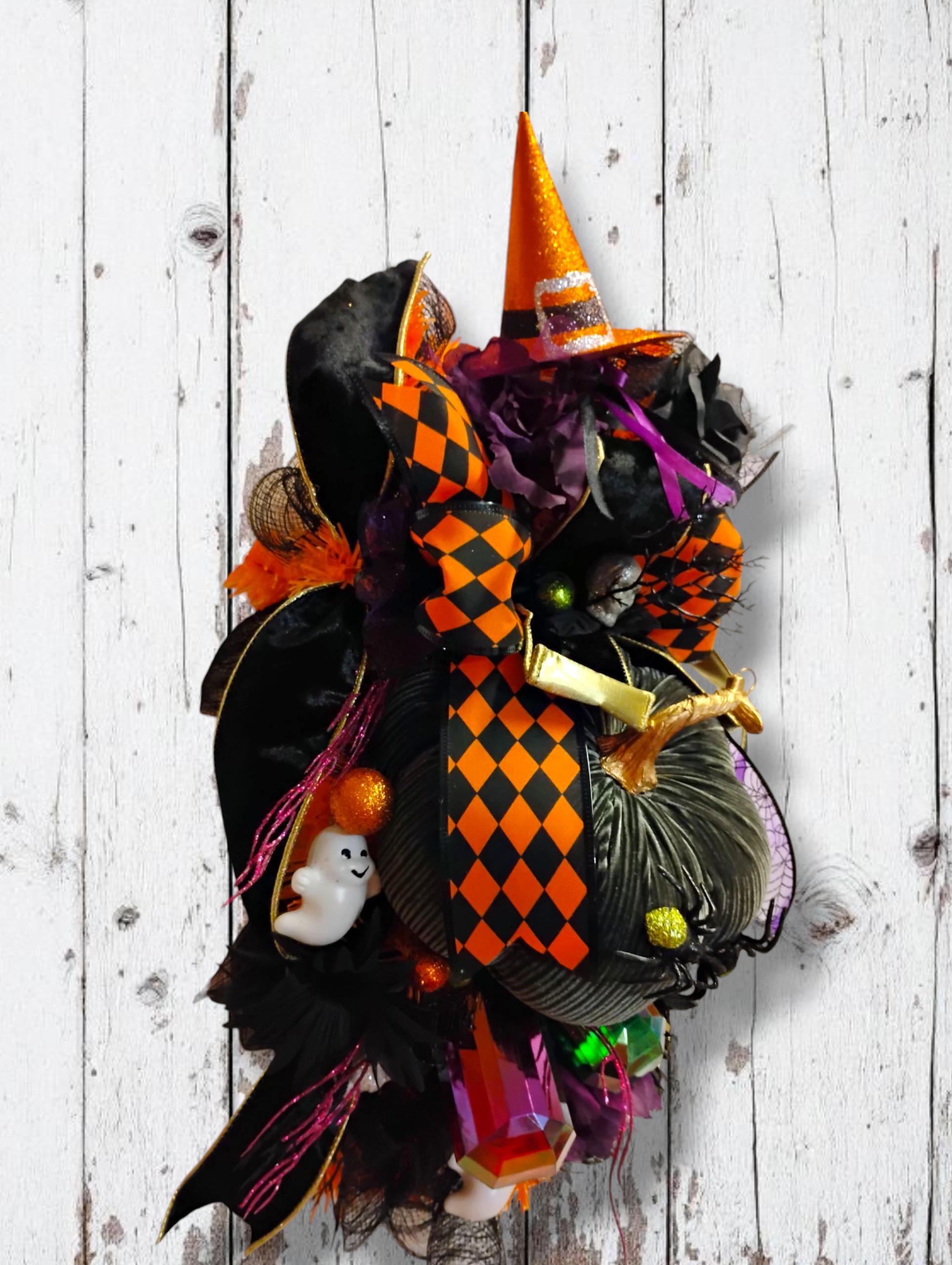 Add some spooky fun to your front door with this one-of-a-kind Halloween witch wreath! This handmade design features a velvet pumpkin, glittery orange witch hat, black roses, harlequin bows, and whimsical Halloween accents that pop against layers of black, purple, and orange. Perfect for adding bold, gothic glam flair to your home this Halloween season.