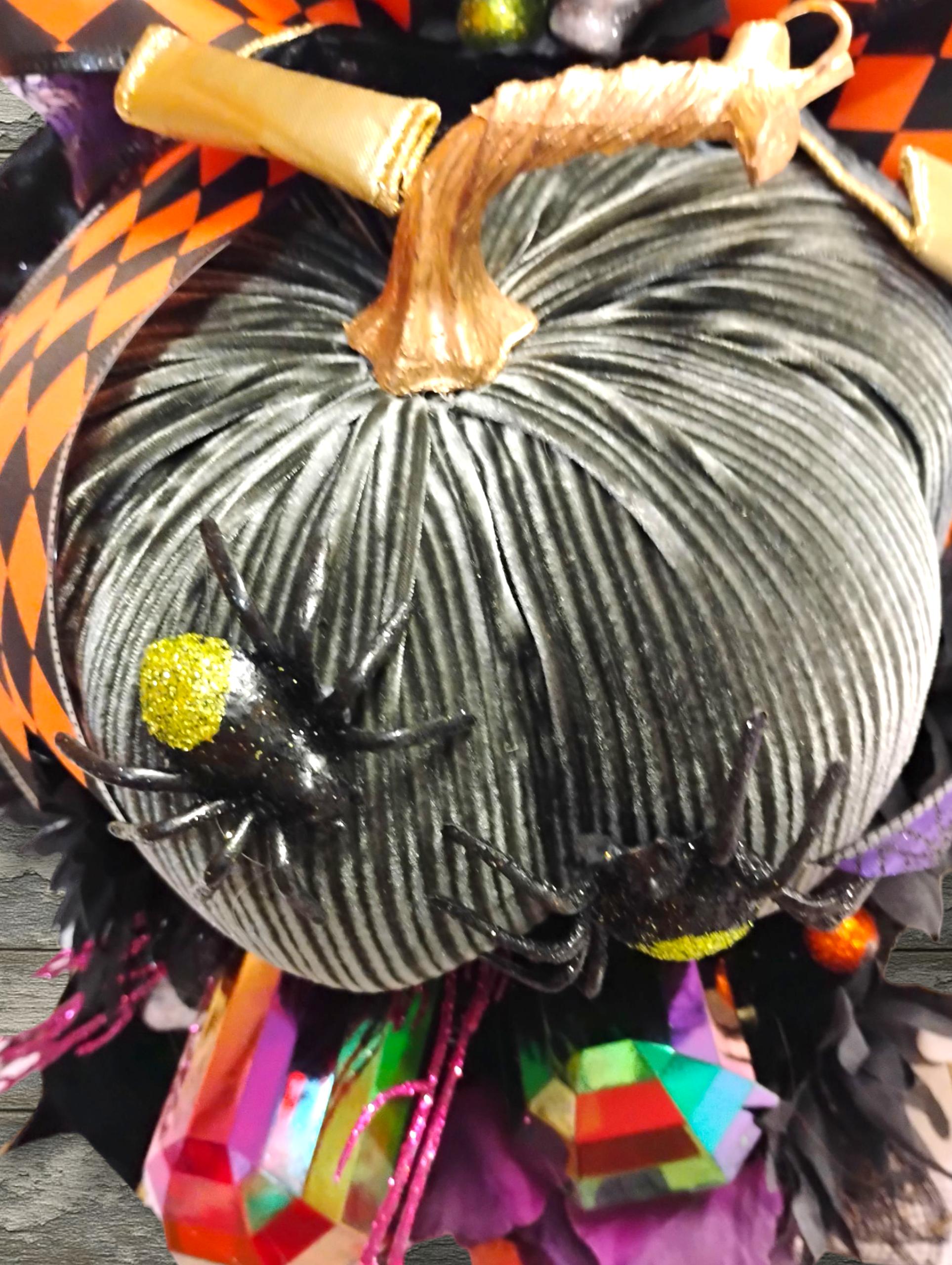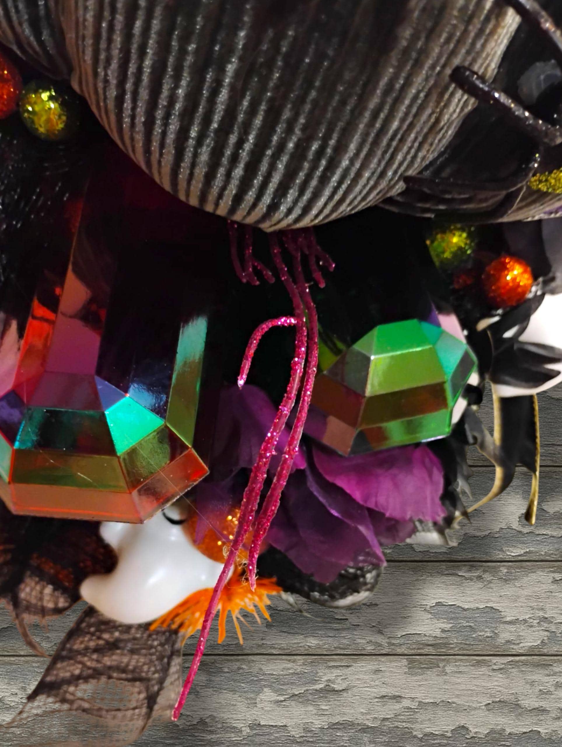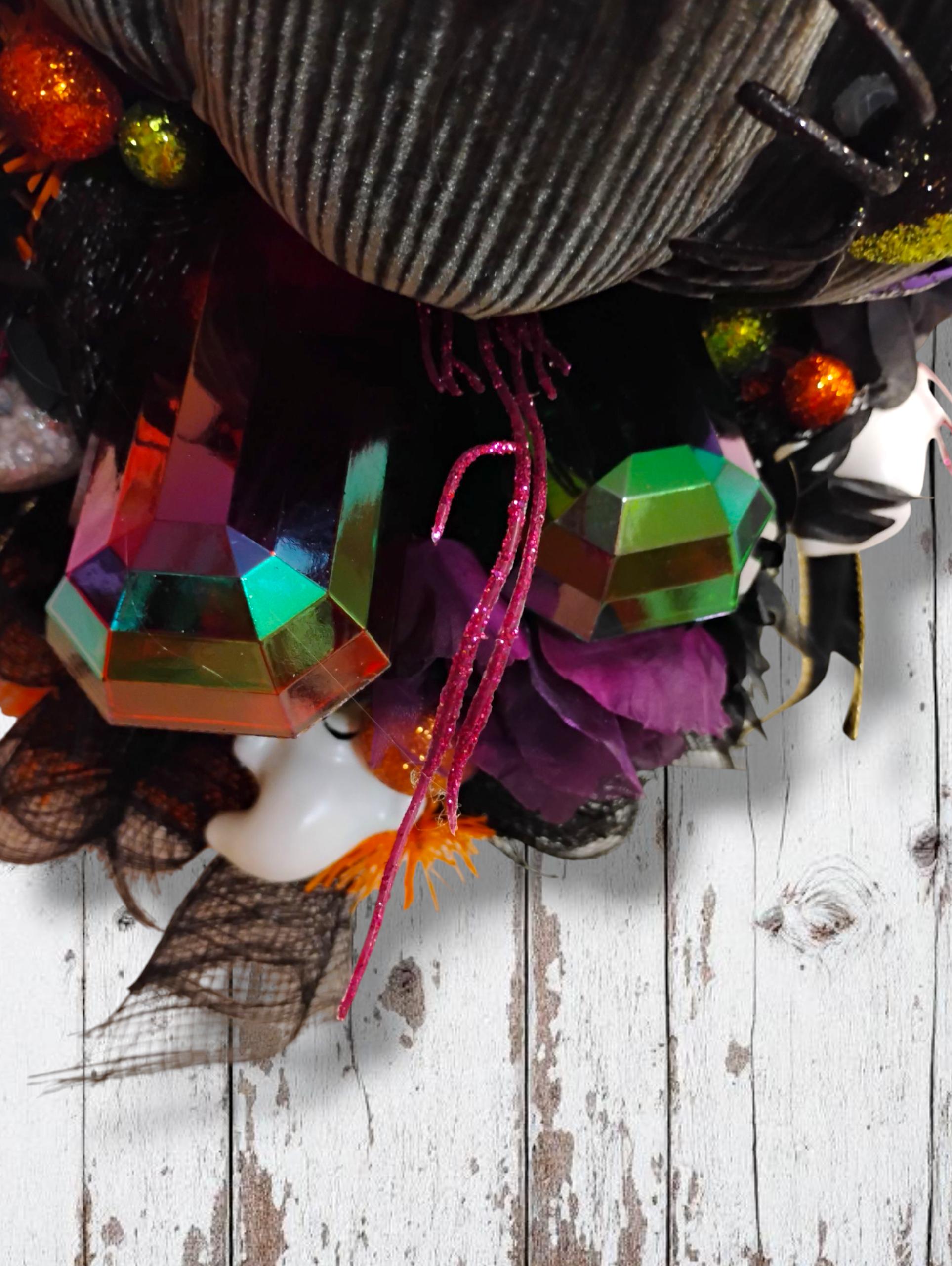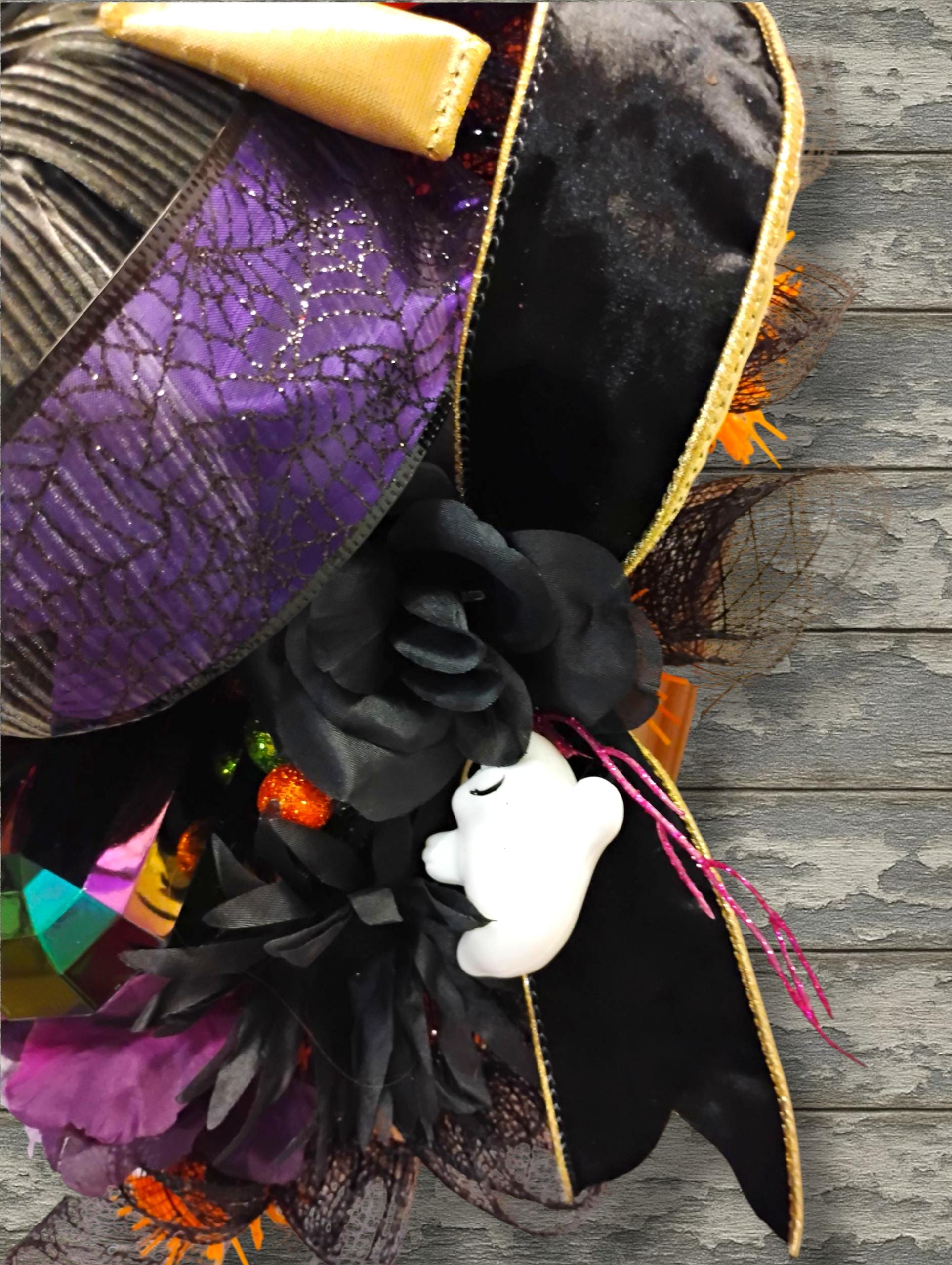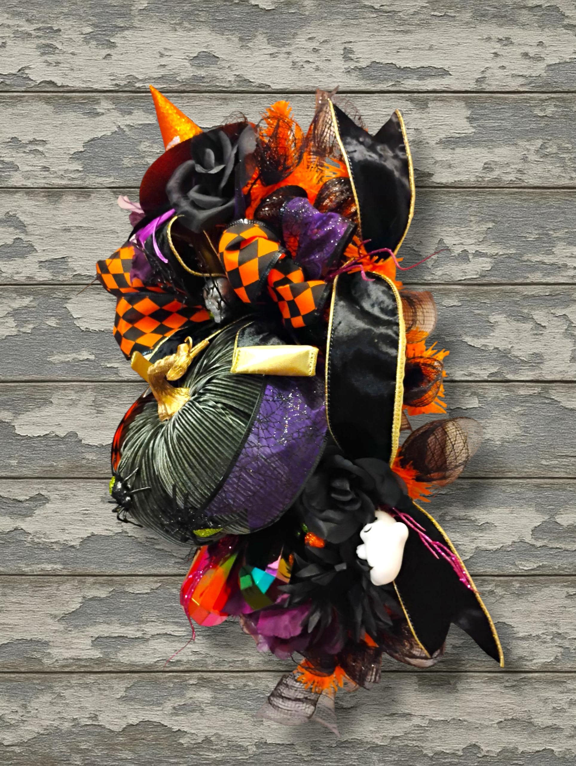 Add some spooky fun to your front door with this one-of-a-kind Halloween witch wreath! This handmade design features a velvet pumpkin, glittery orange witch hat, black roses, harlequin bows, and whimsical Halloween accents that pop against layers of black, purple, and orange. Perfect for adding bold, gothic glam flair to your home this Halloween season.
