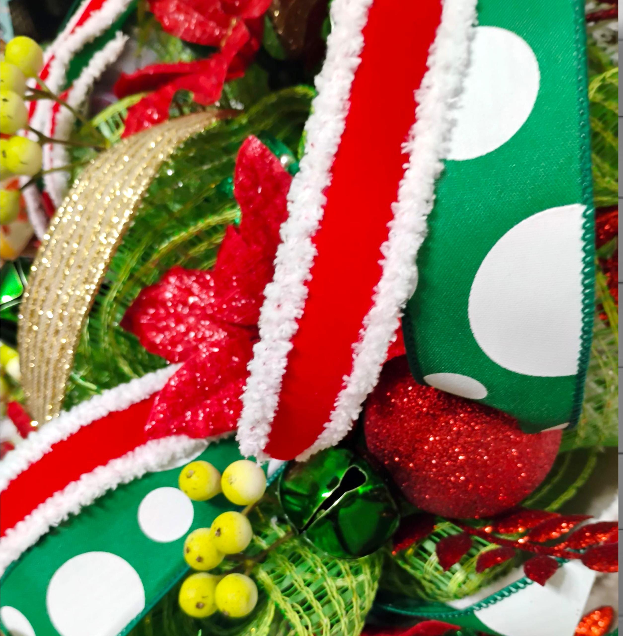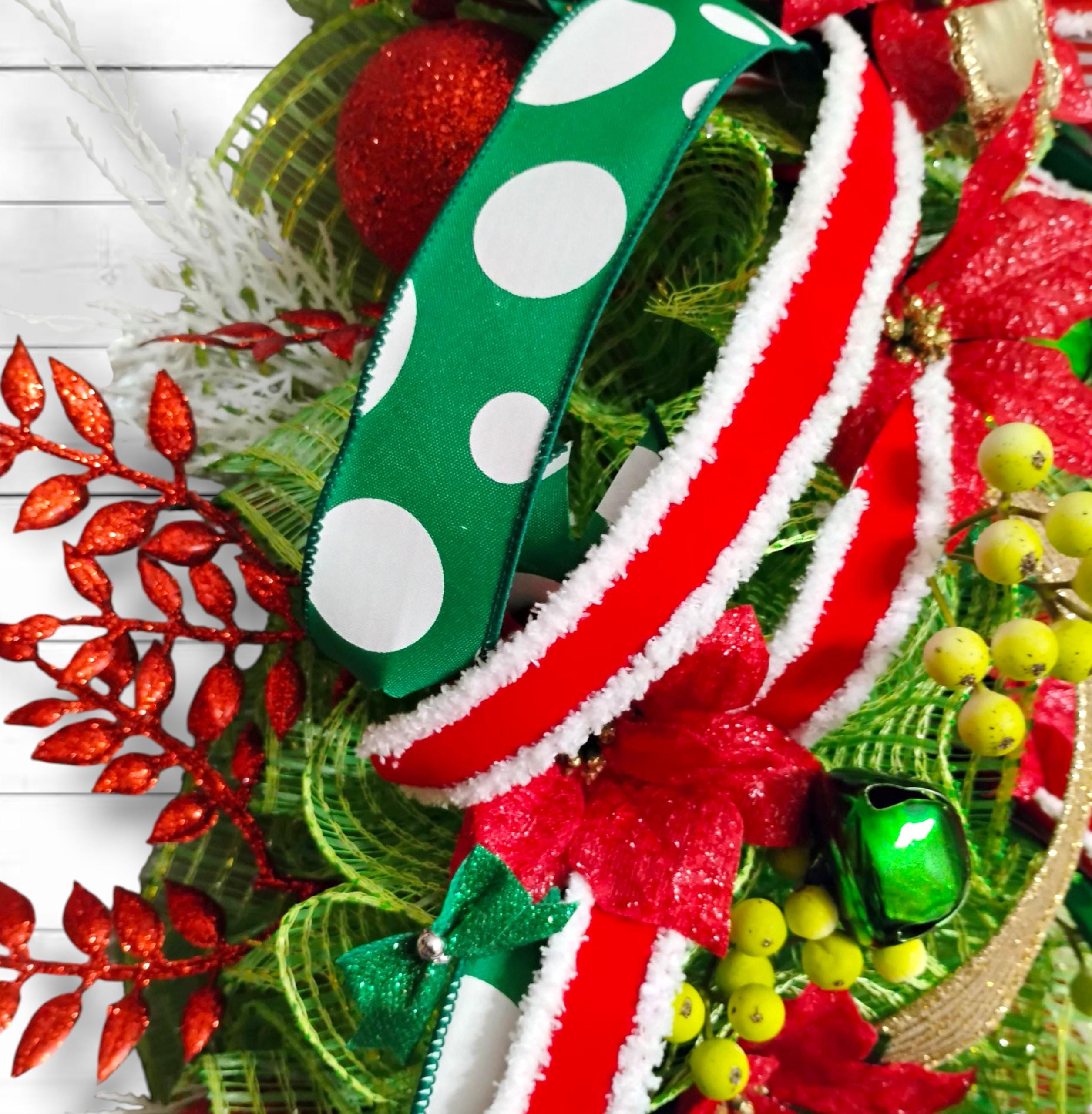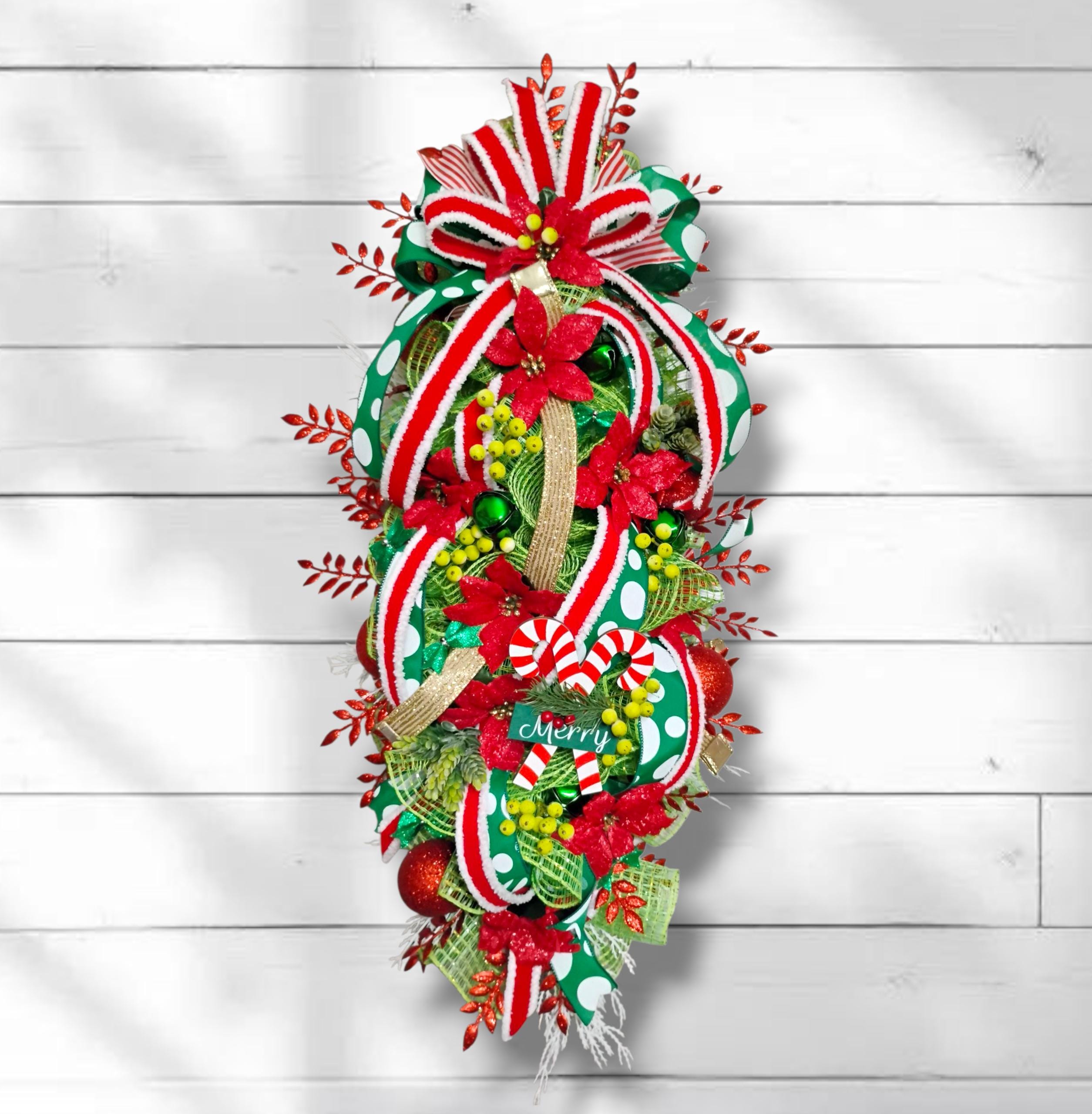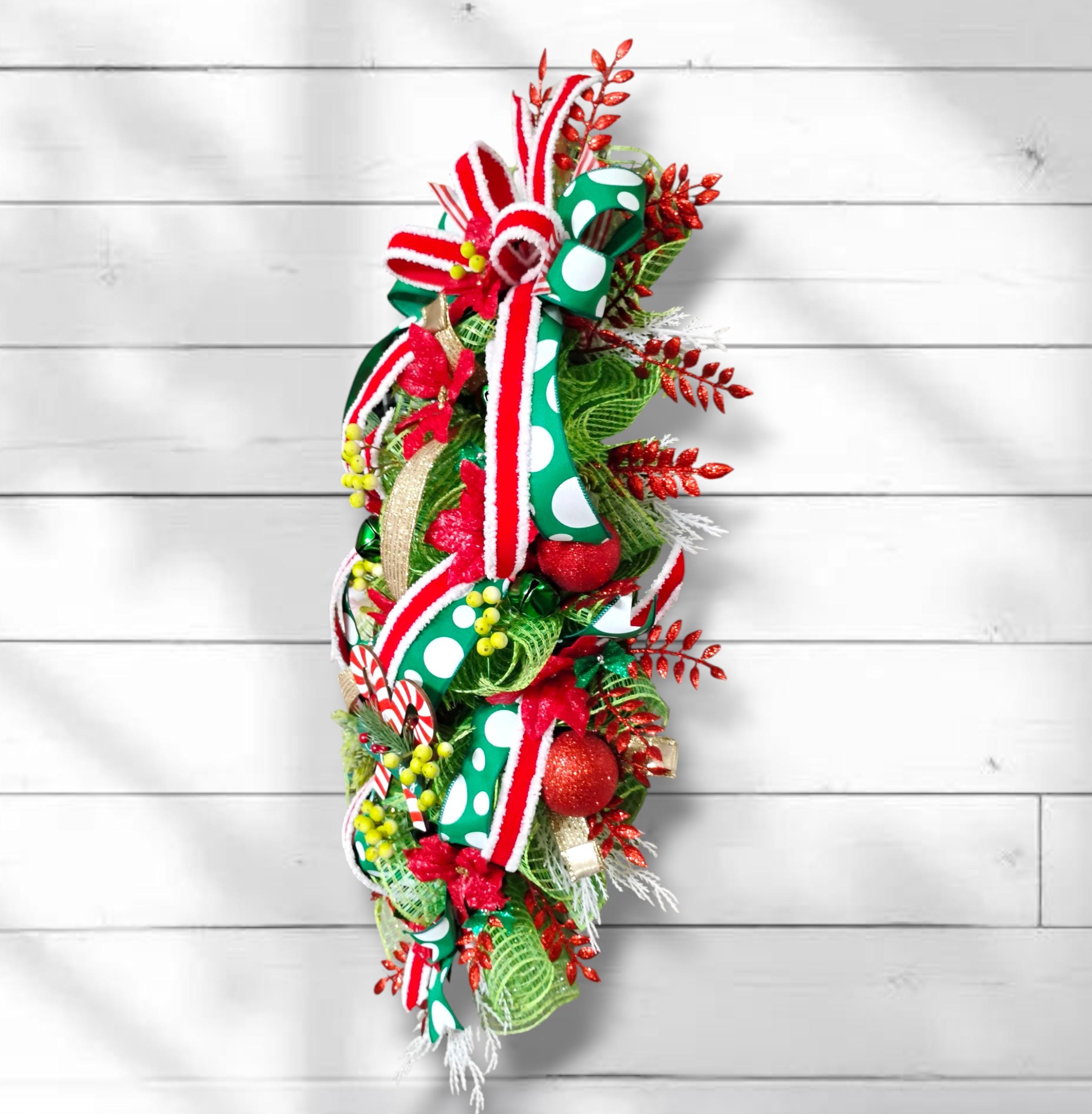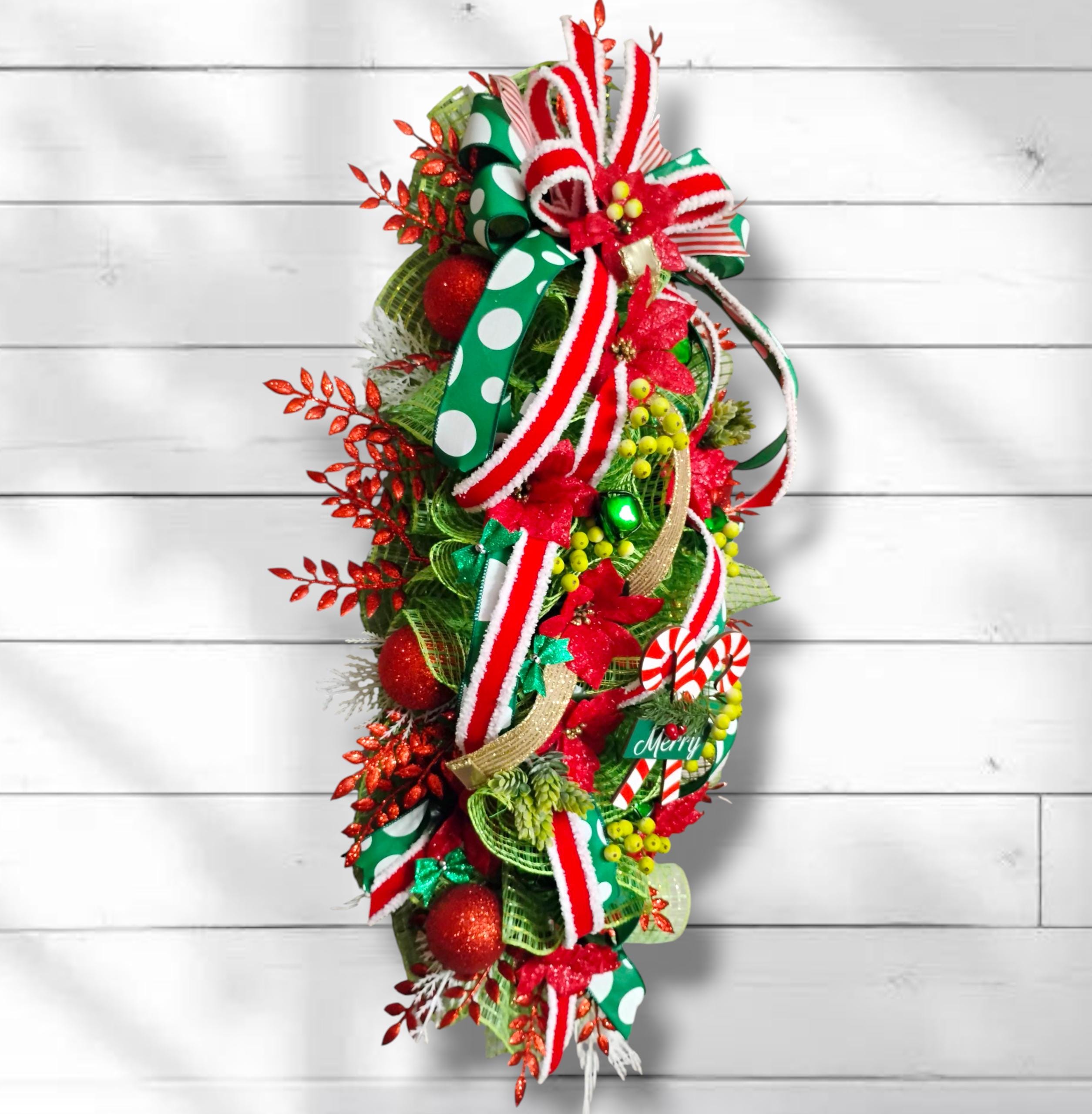 Bring candy cane cheer to your door this holiday season! 🎄 This handmade Christmas swag wreath is full of festive details, jingle Bell sounds, and high-quality ribbon that really makes it pop.