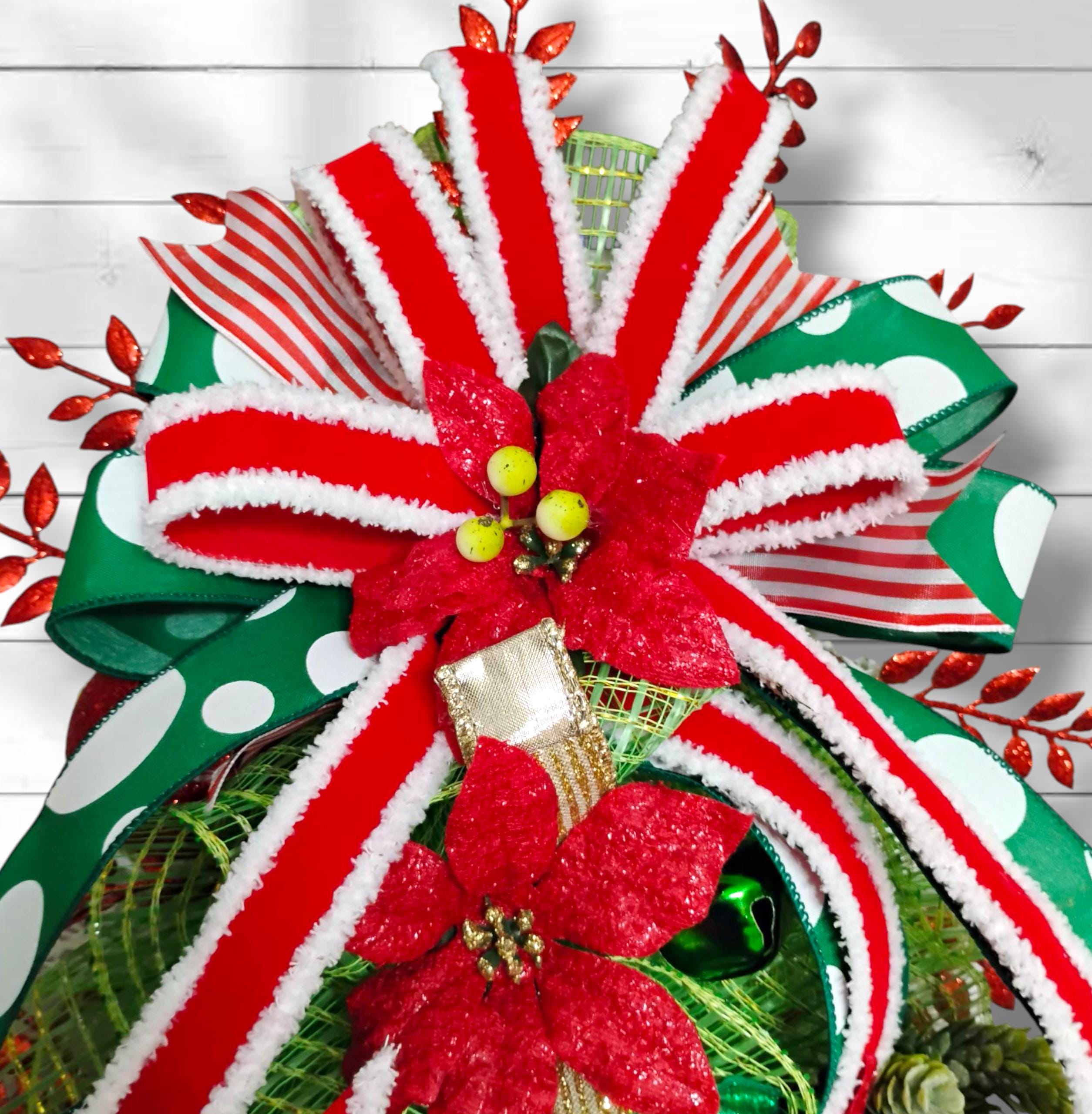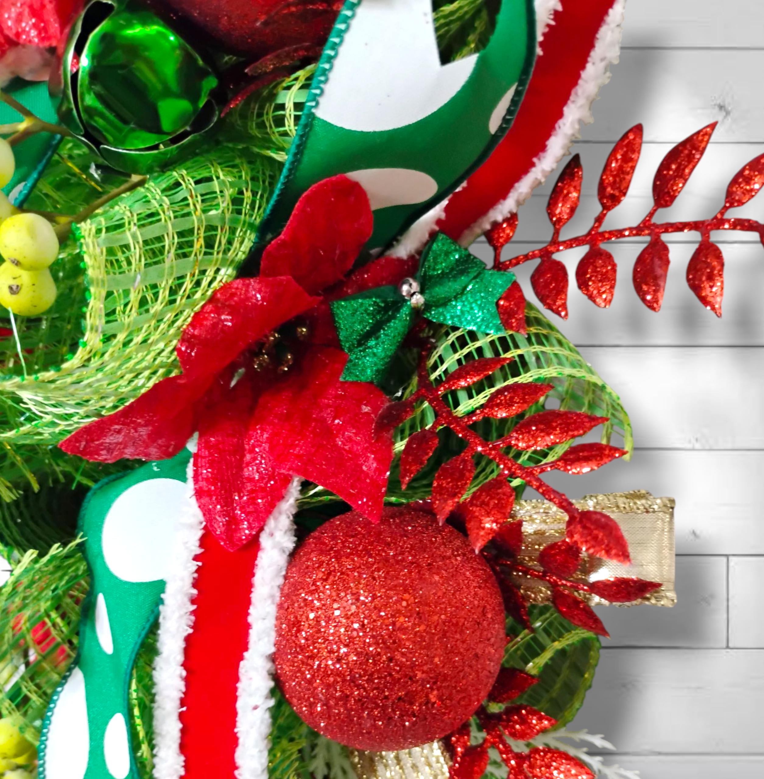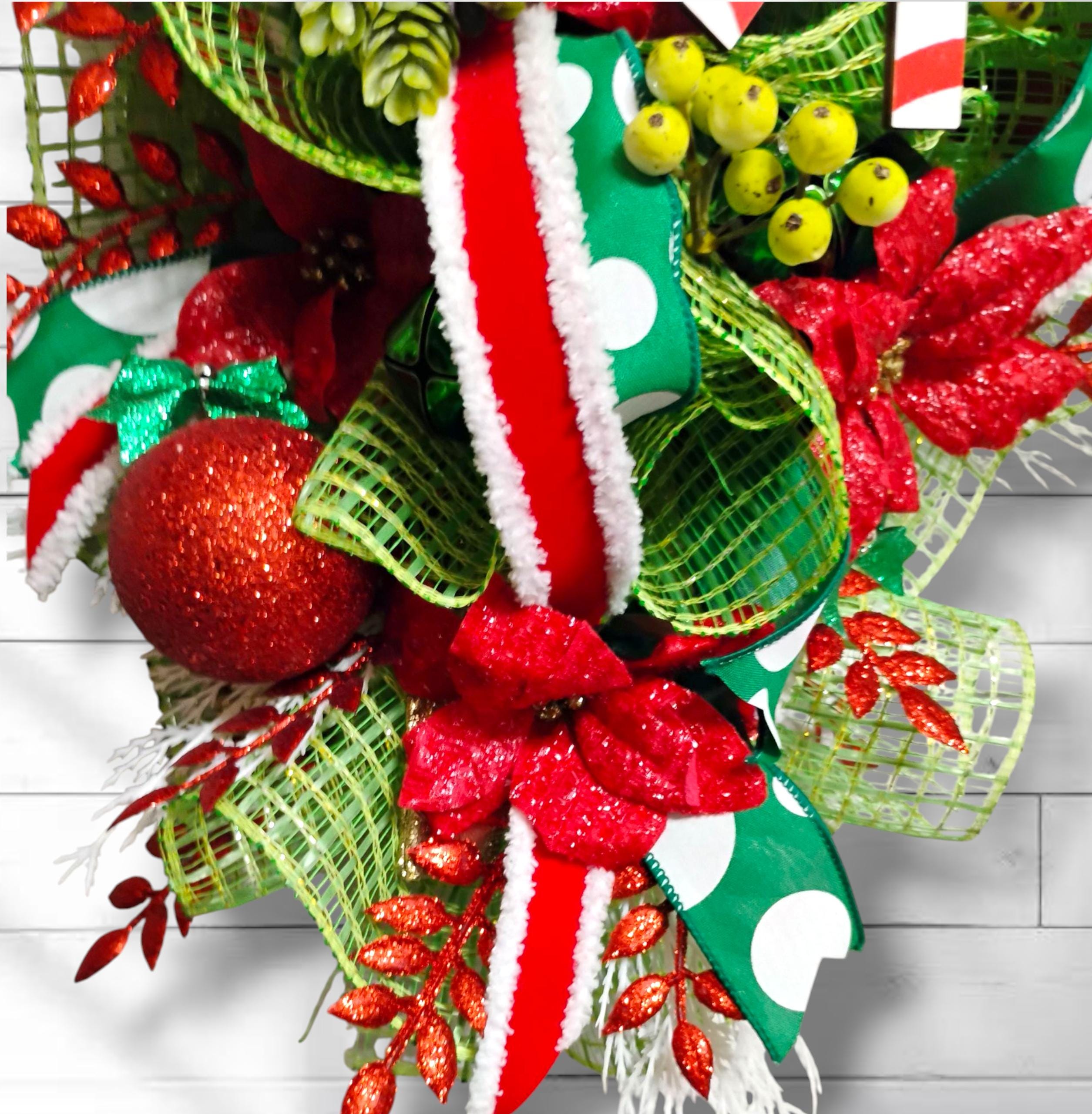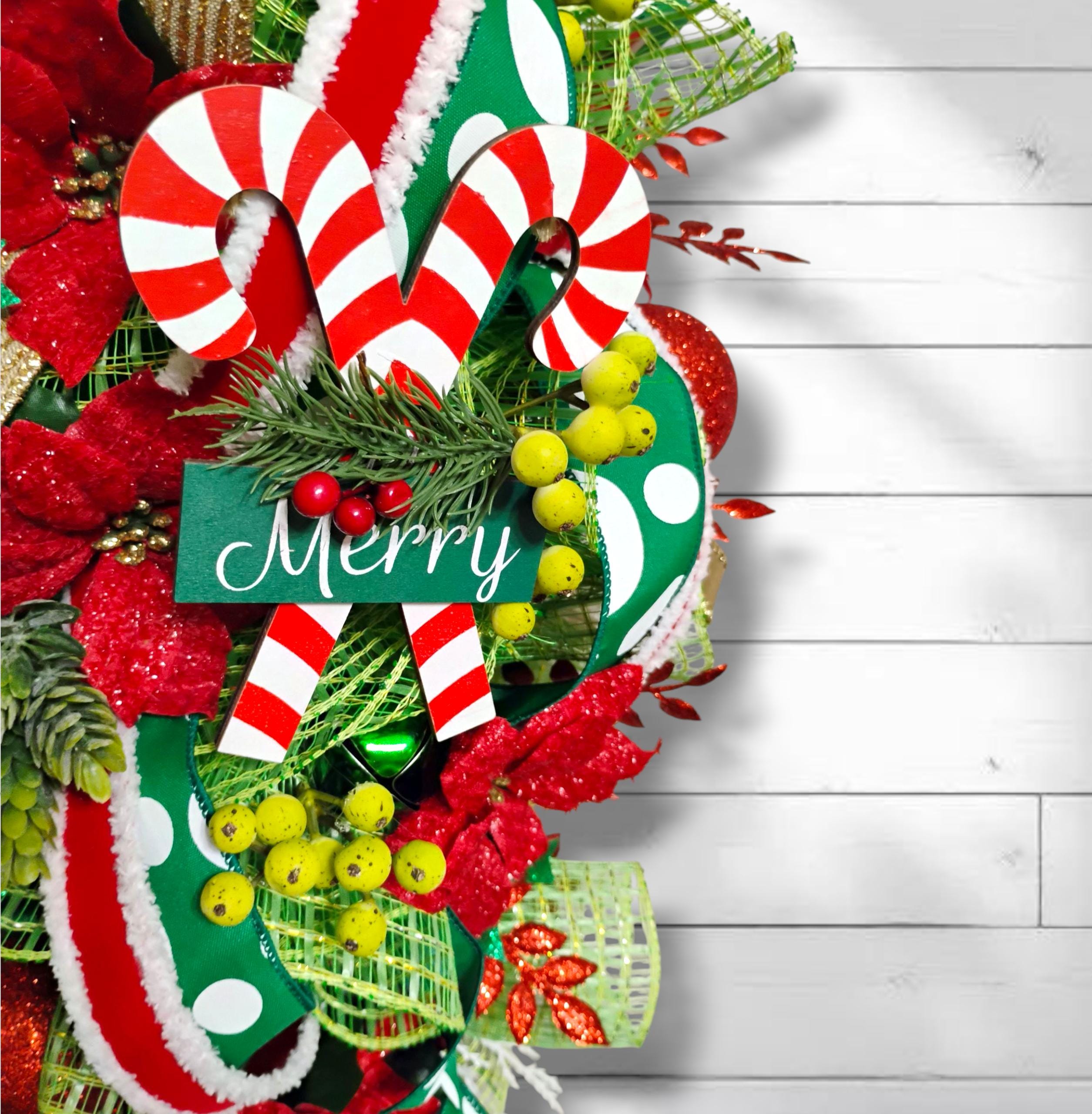 ✨ Accents: Candy canes, poinsettias, ornaments, frosted greenery, and green jingle bells