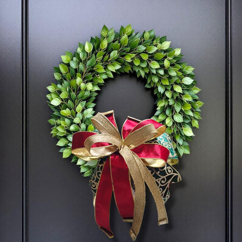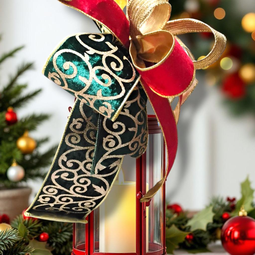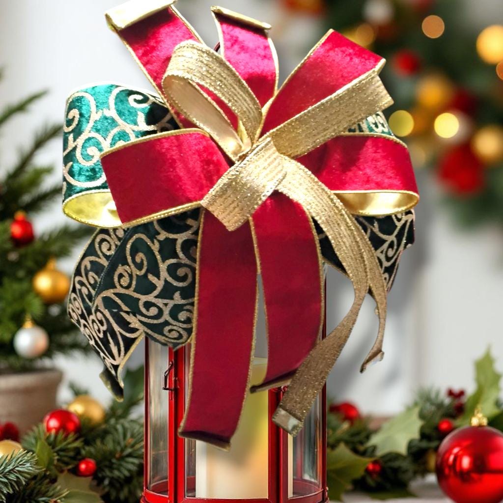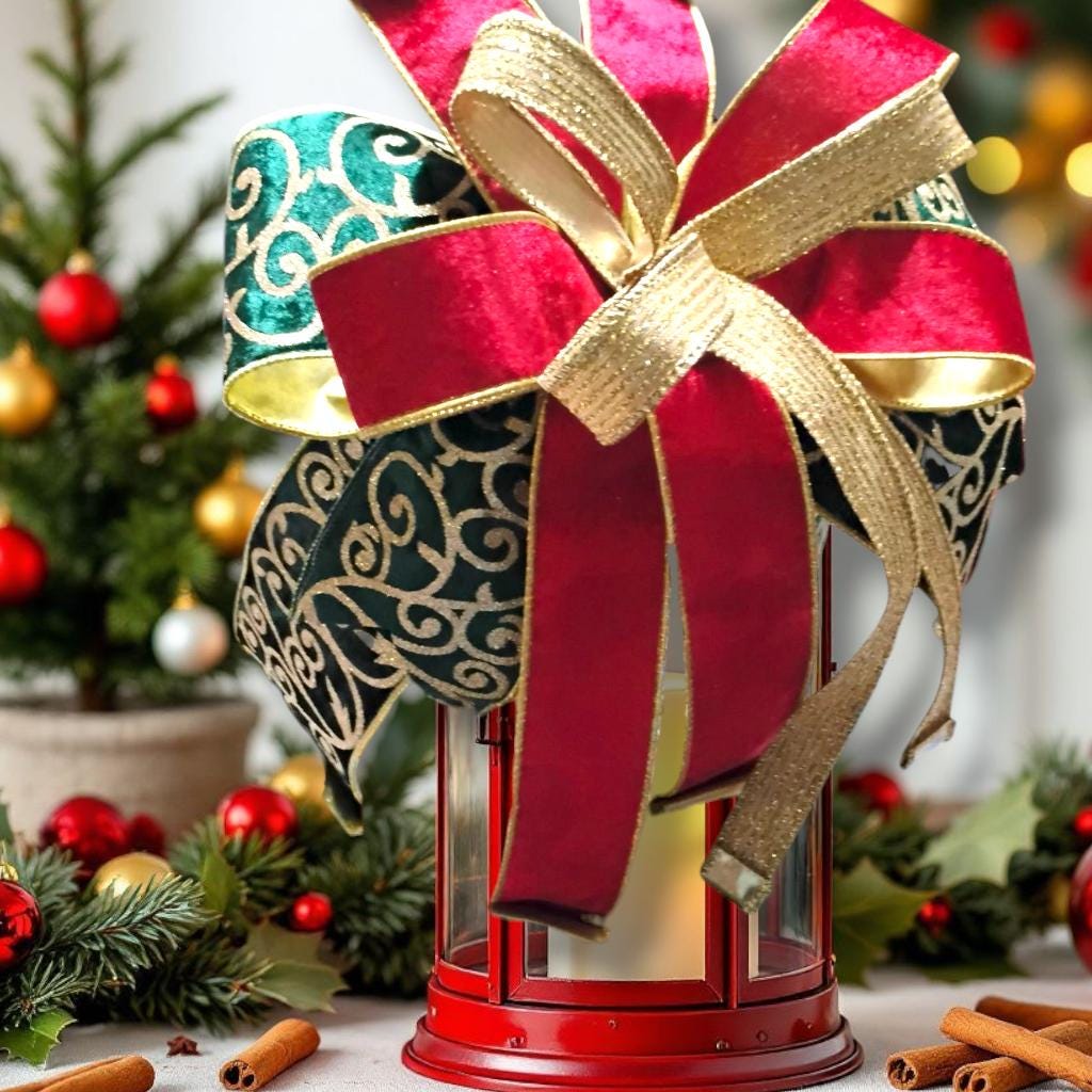 Crafted with premium velvet and wired ribbon in deep red, gold, and green scroll, this bow brings a rich farmhouse Christmas look that stands out from ordinary store-bought decor.